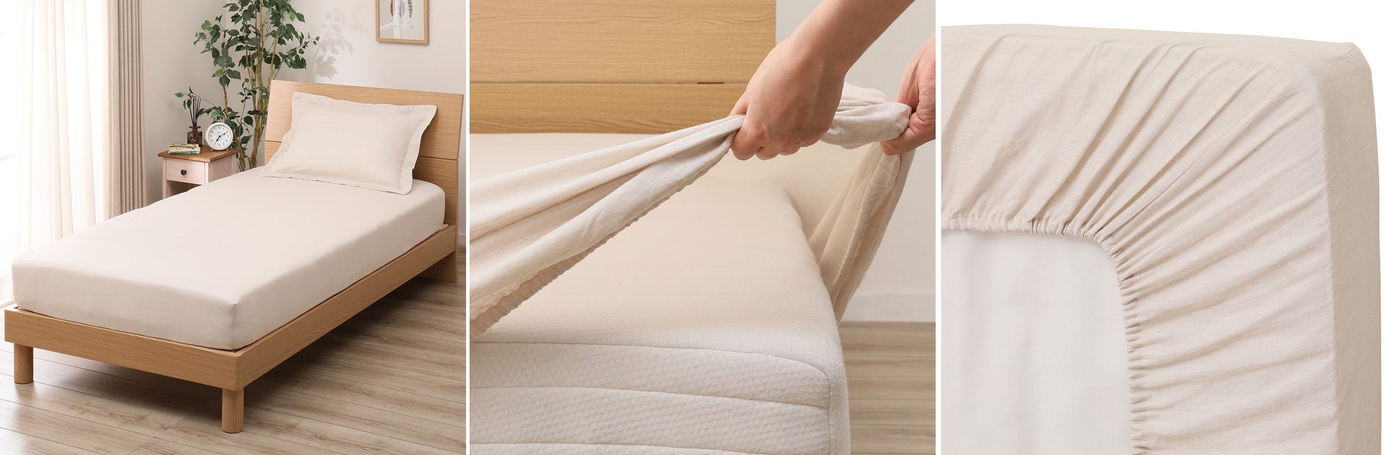 ラインナップはシーツ、掛け布団カバー、枕カバー。カラーは寝室のイメージにあわせて、ベージュとホワイトの2色からお選びいただけます。
