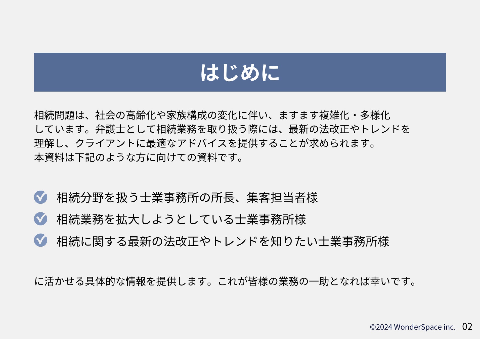 ・相続分野に特化している士業事務所様 ・相続業務を拡大しようとしている士業事務所様 ・相続に関する最新の法改正やトレンドを知りたい士業事務所様 |