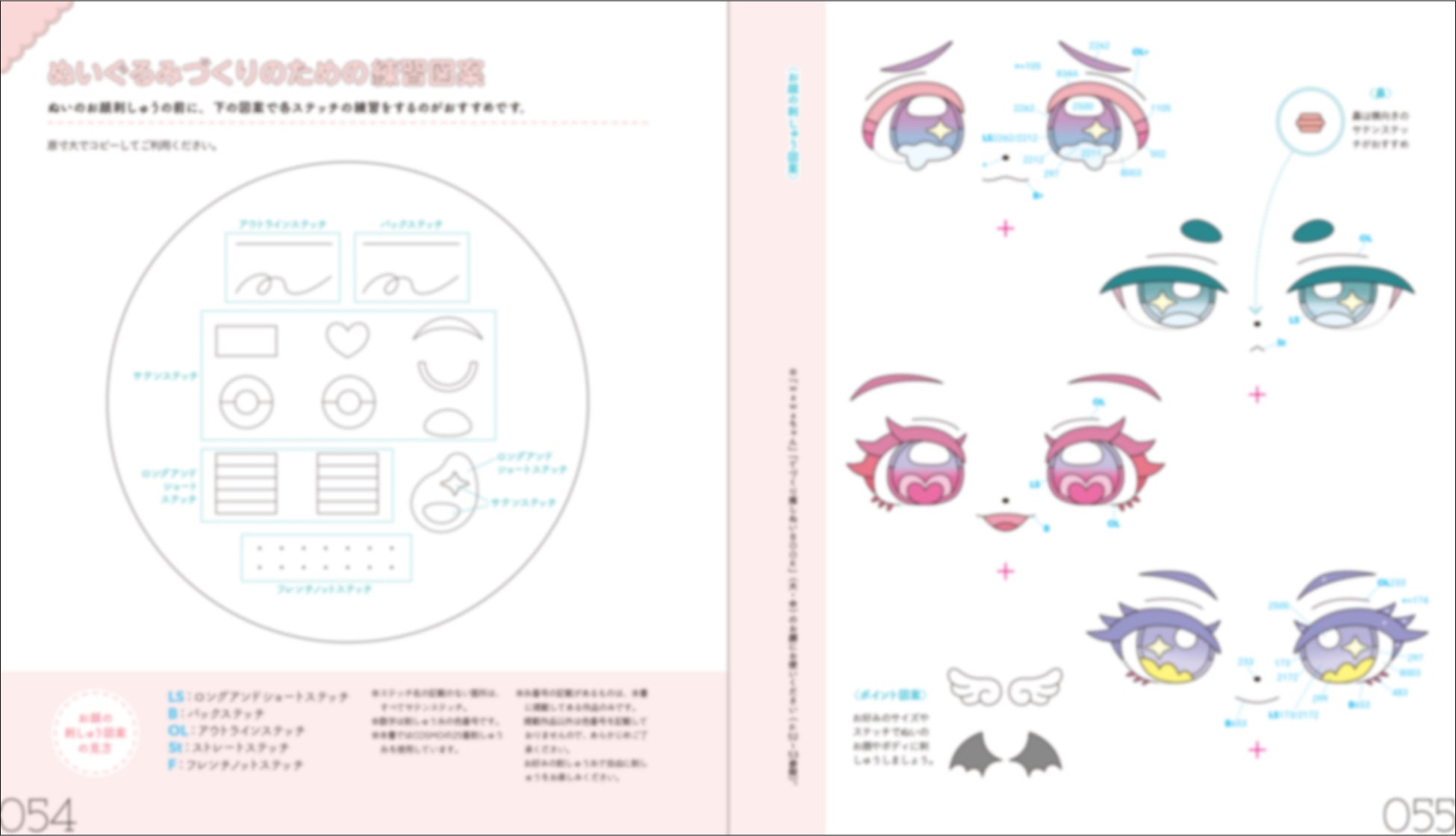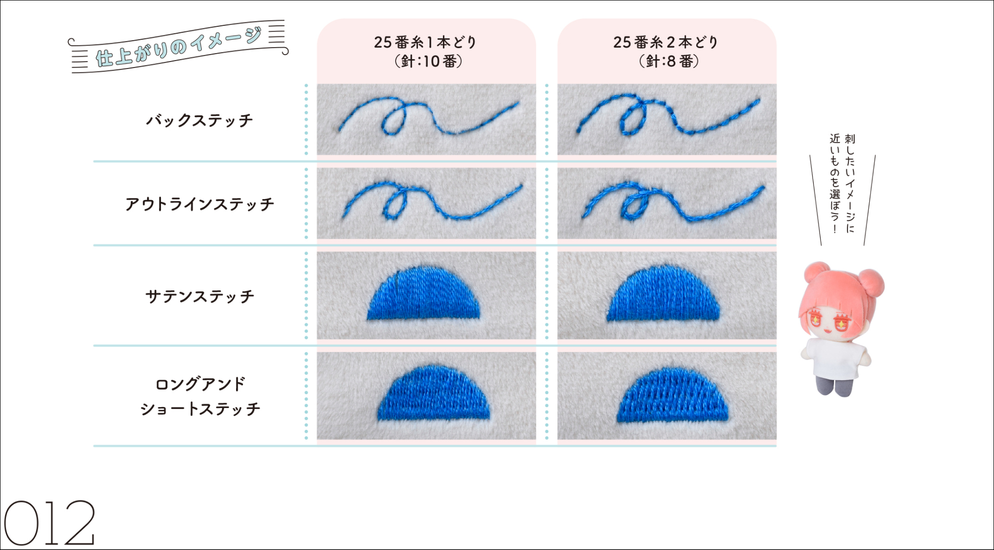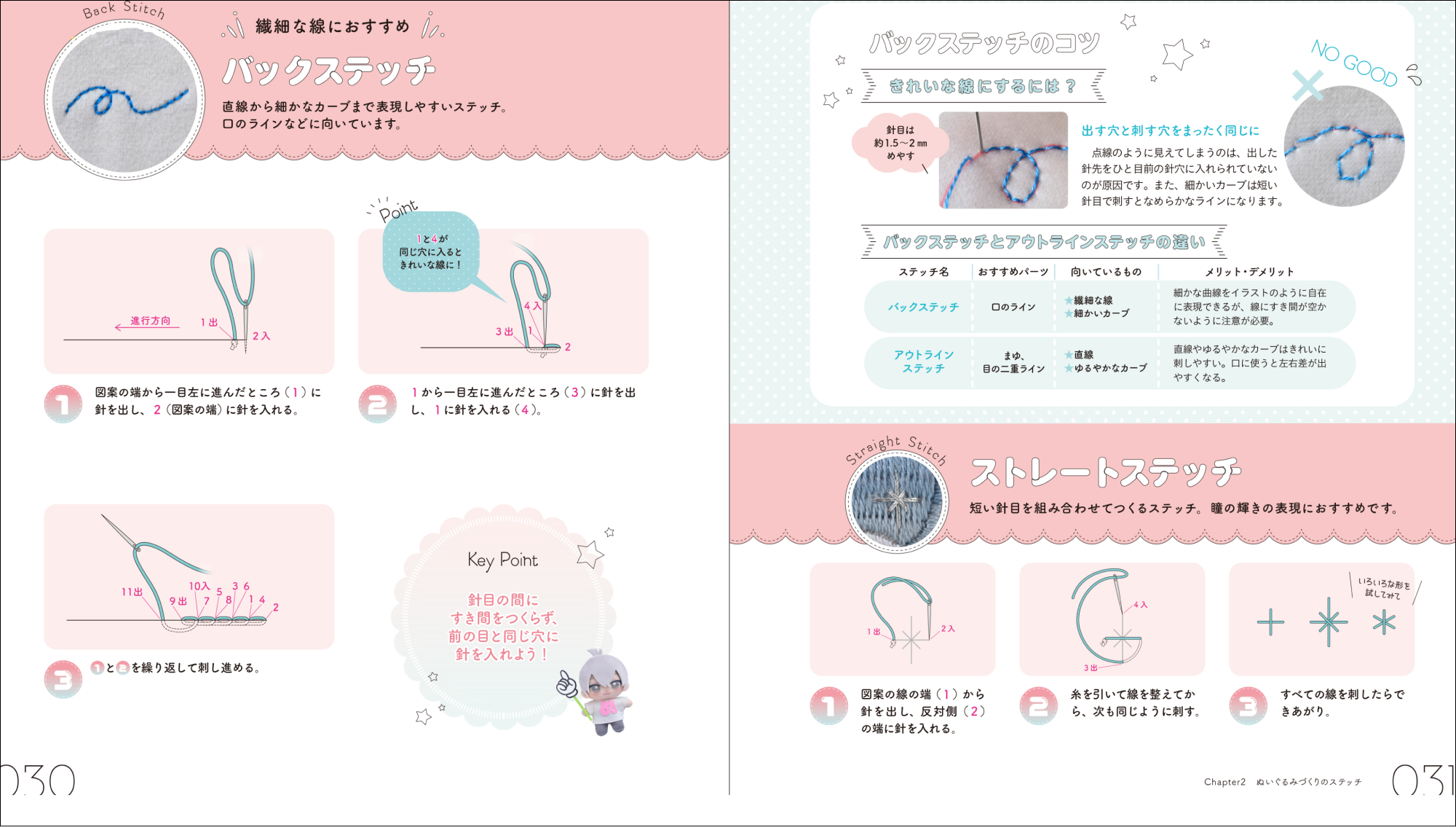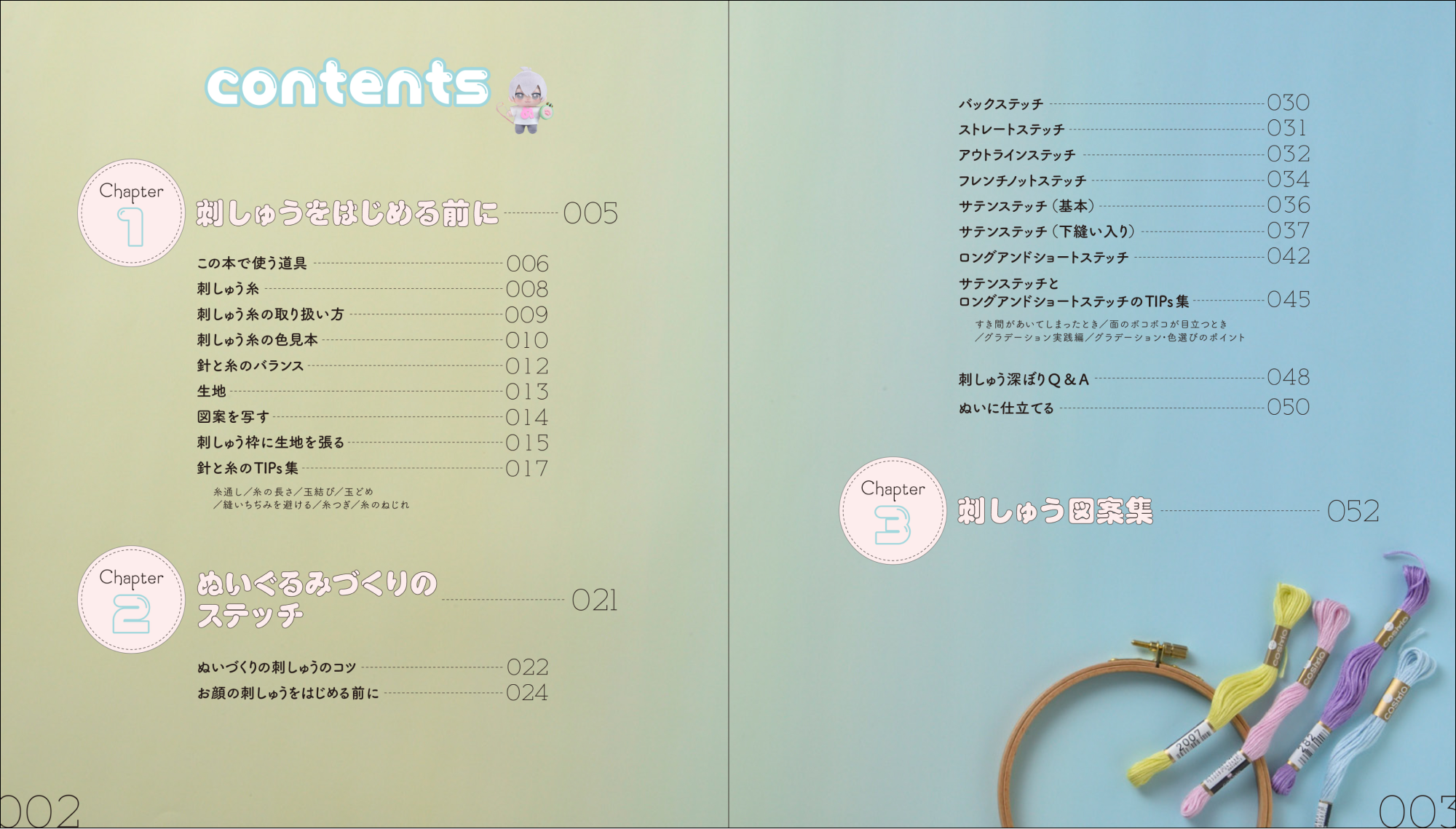 道具選びのポイントから、ややマニアックなテクニックまで推しぬい刺しゅうの基本がわかります。推しぬいの肝となるお顔の刺繍、またいろんなボディに使える商用利用OKの図案が22種類も掲載され、丁寧に解説します。