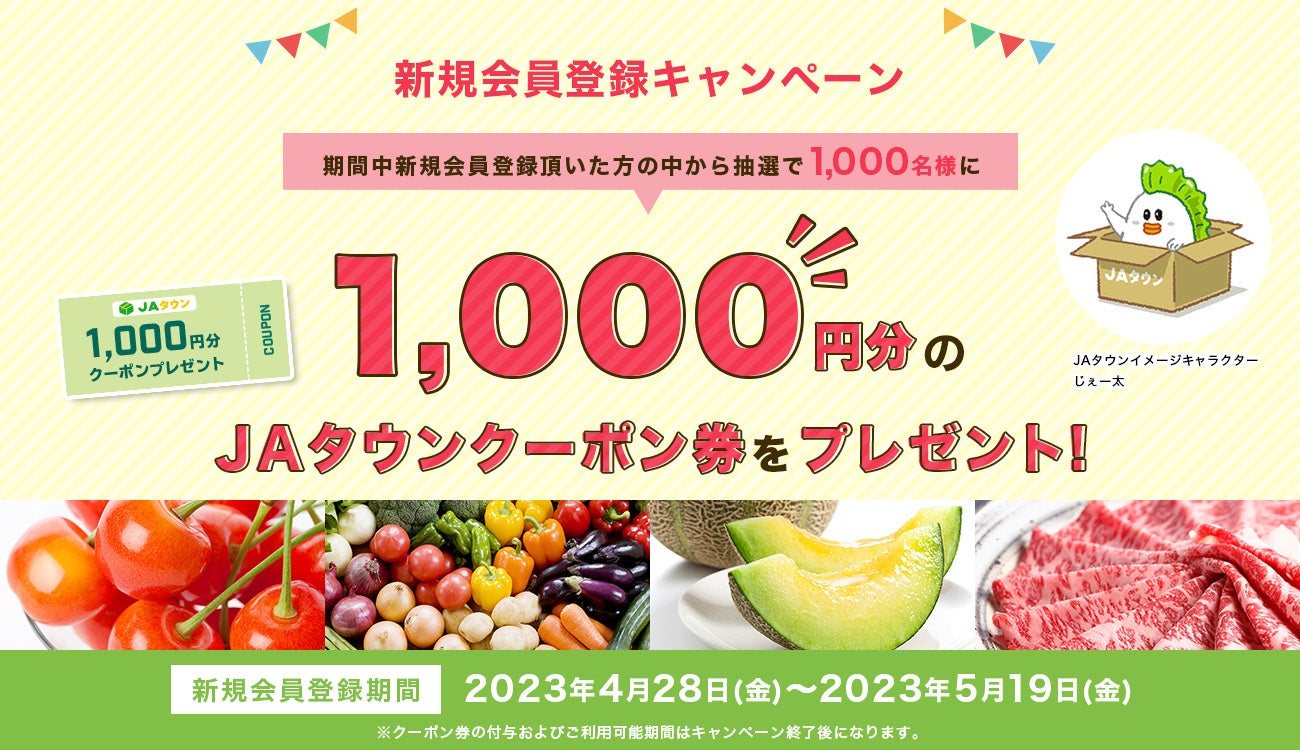 内 容:期間中、JAタウン新規会員登録頂いたお客様の中から抽選で1,000名様に1, 000円分のJAタウンクーポン券をプレゼント