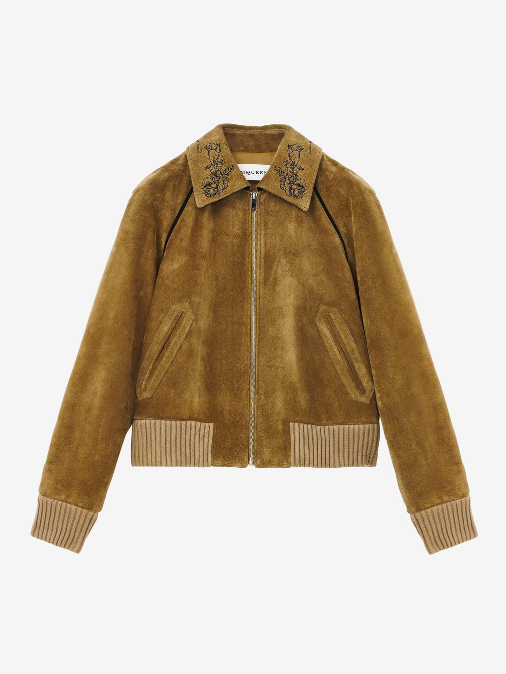 2025年秋冬プレコレクションより、ローズタトゥーの刺繍があしらわれたスエード ボンバージャケットを着用しています。