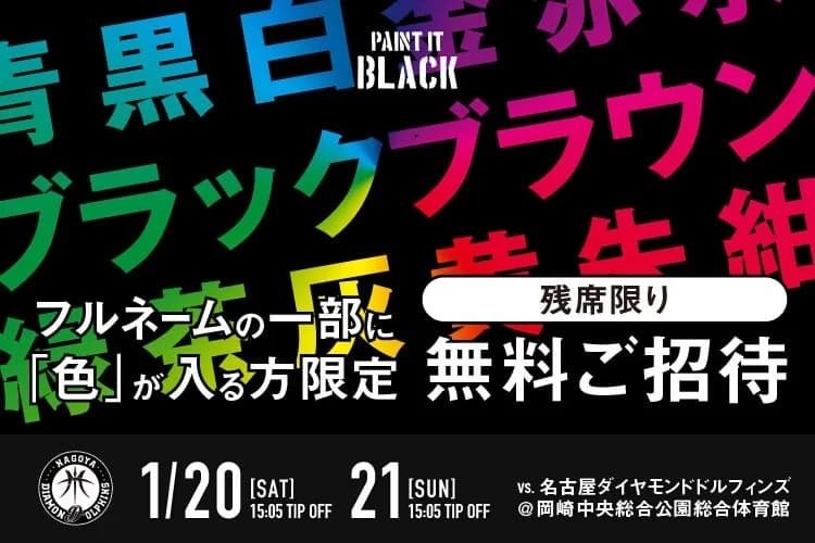 1月20日(土),21日(日)名古屋ダイヤモンドドルフィンズ戦の節テーマは「Paint it BLACK」!節テーマにちなんで、フルネームの一部に「色」が入る方限定、残席限りで無料でご招待します!