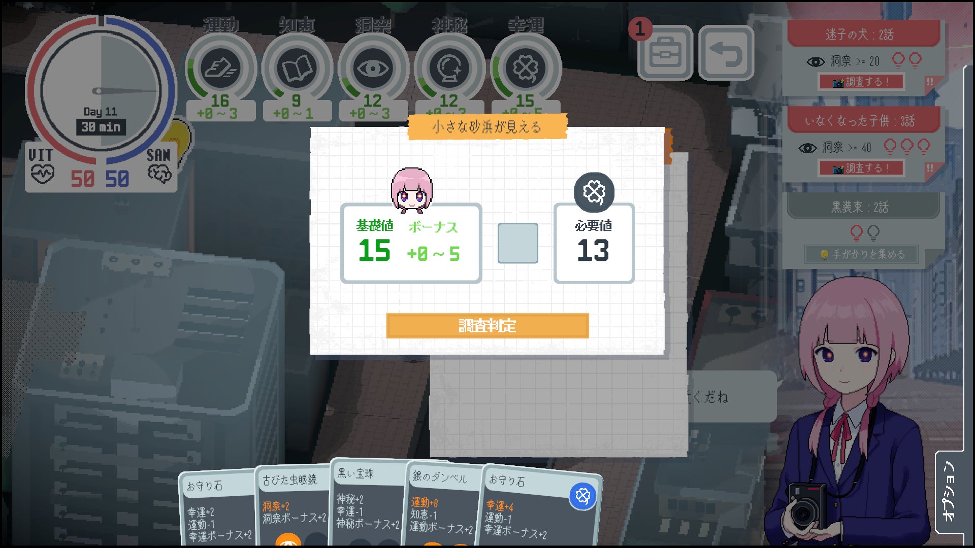 一部のイベントでは、プレイヤーのパラメータによって「調査判定」が行われます。