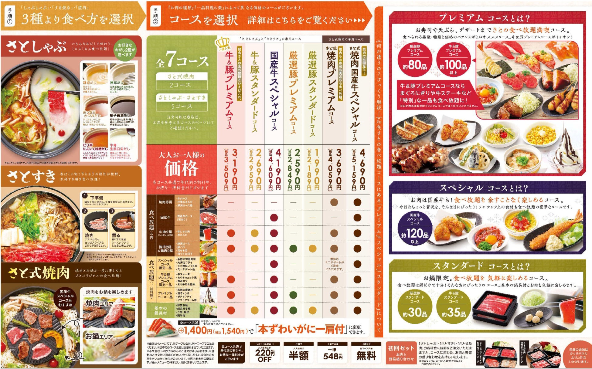 和食さとの「食べ放題プレミアムコース」は、焼肉、しゃぶしゃぶ、すき焼きの食べ放題が選べて、さらに一品料理も食べ放題です。人気の牛&豚プレミアムコースでは、「まぐろのお寿司や海老天ぷら」などオーダー毎に調理した出来立ての料理が食べ放題!!特にサーモンや海老の「炙り寿司」は、注文の都度炙って提供しますので芳ばしい香りをお楽しみいただけます。ご注文はテーブルのタッチパネルでオーダーして頂き、お料理はテーブルまでお届けします。