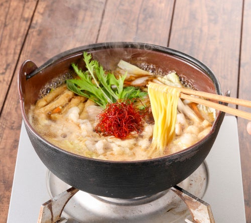 大粒の牡蠣が3つ入った大海老の天ぷら付の鍋焼きうどん。コシのある太麺を使用し、卓上で炊きながら最後まで熱々でお楽しみいただけます。