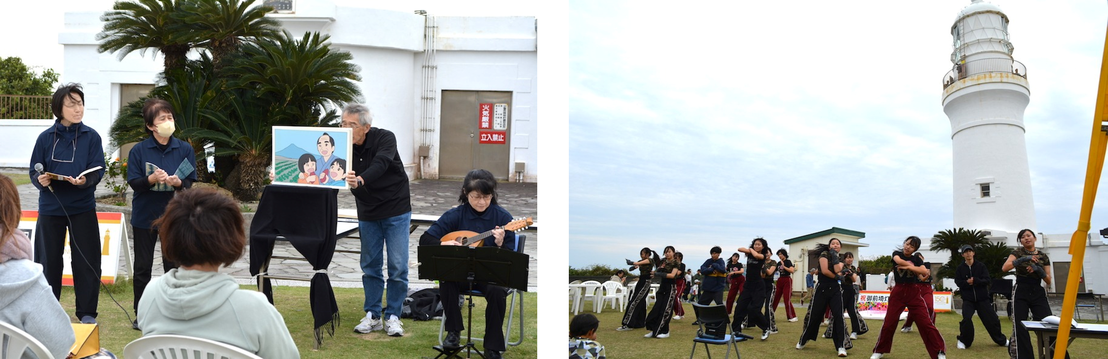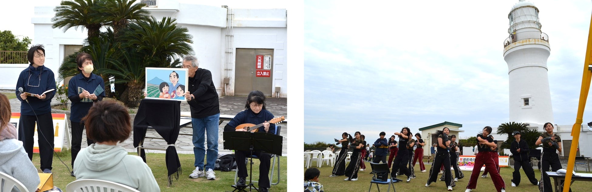 今年初の試みとして、市民団体「ピノキオ」が紙芝居『いもじいさん』および絵本の読み聞かせを行いました。また、昨年から継続して、灯台メッセージパネルの設置、風車づくり、灯台あおぞら図書館、「燈の守り人」御前埼灯台コスプレイヤーの参加、灯台マルシェ、灯台アンケート、共催イベントとしての灯台クイズなど、多彩なプログラムを開催しました。