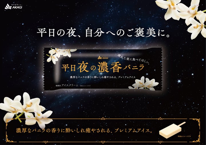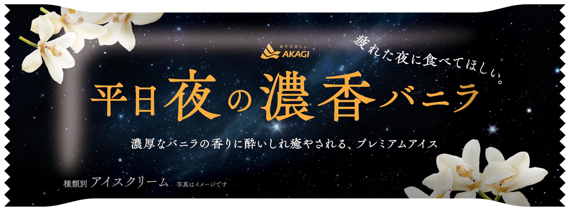 「平日夜の濃香バニラ」は、平日の夜にアイスを食べる人が多いという背景から、疲れた夜に手軽に食べられ、濃厚な香りと味わいで癒されるアイスを作りたいという想いで開発した商品です。マダガスカルバニラ香料を使用しており、濃厚で甘いバニラの香りを楽しむことがでます。さらに、乳脂肪分も高くミルクリッチな味わいも堪能できるプレミアムアイスとなっています。