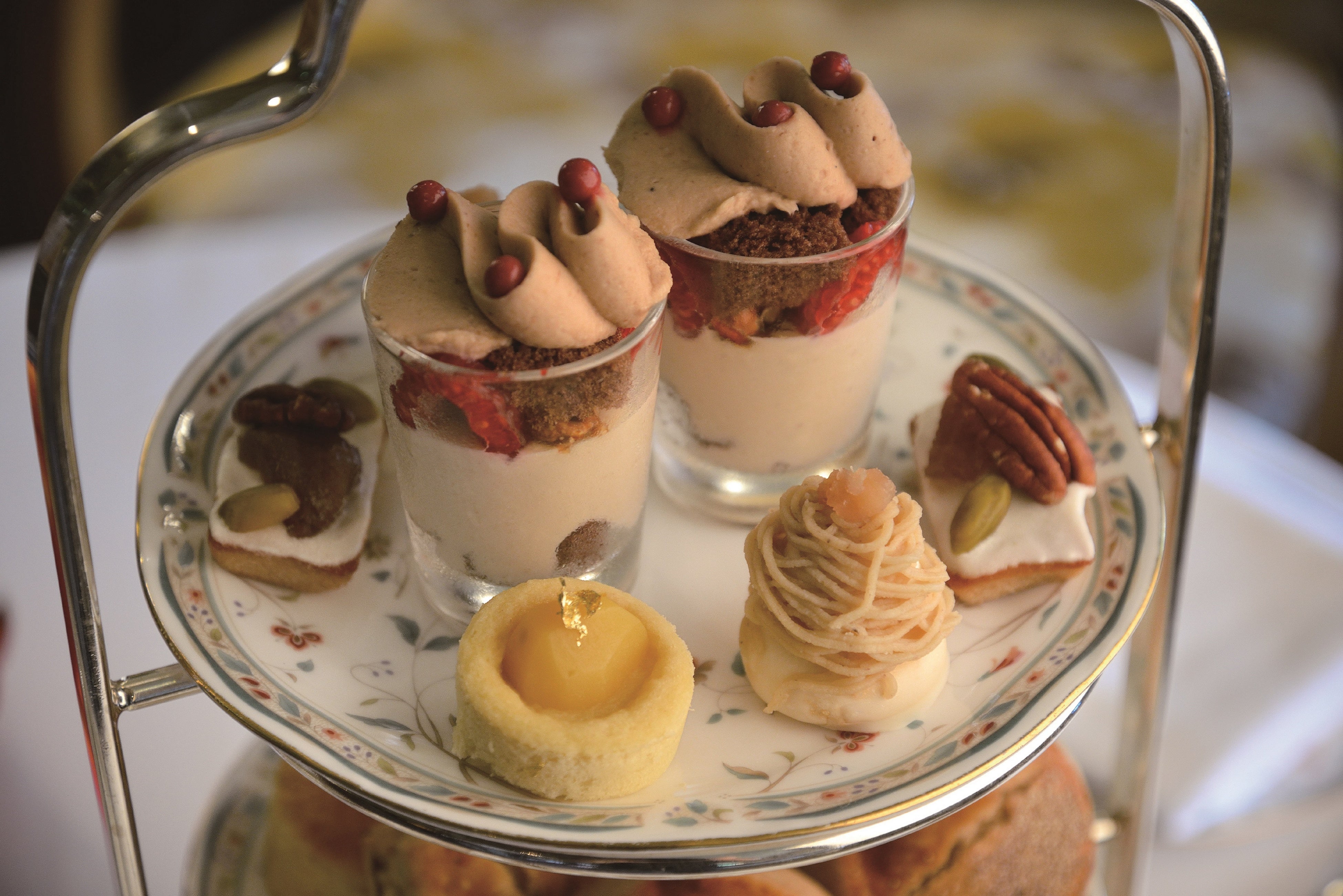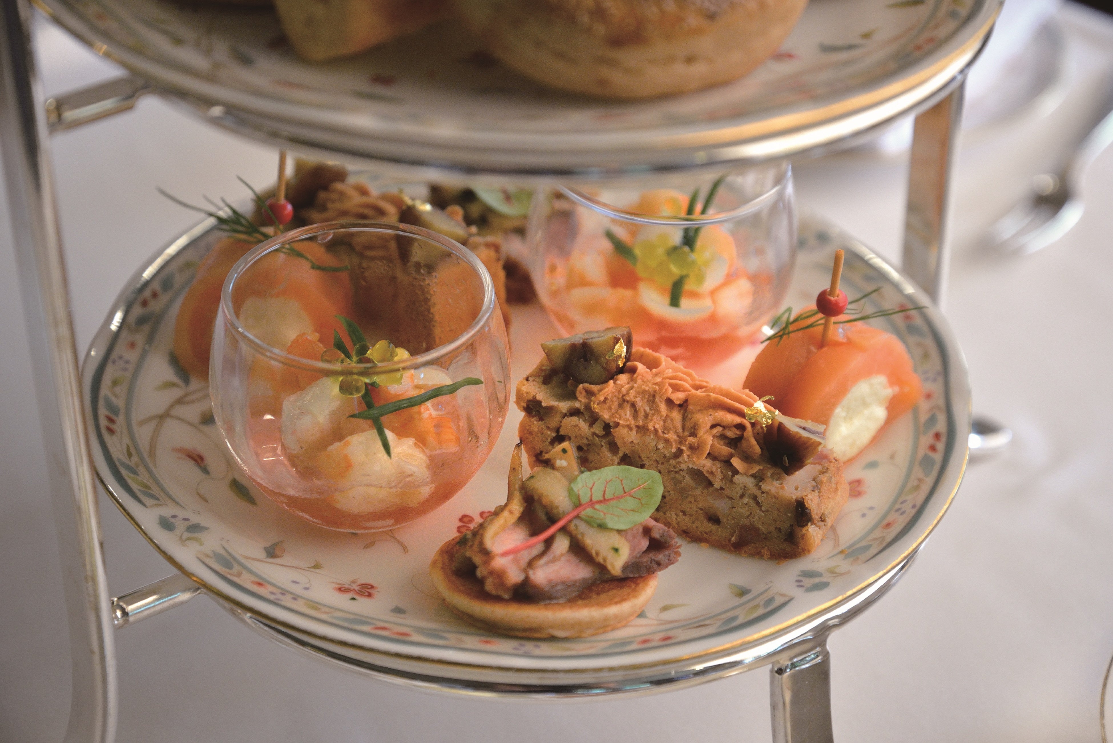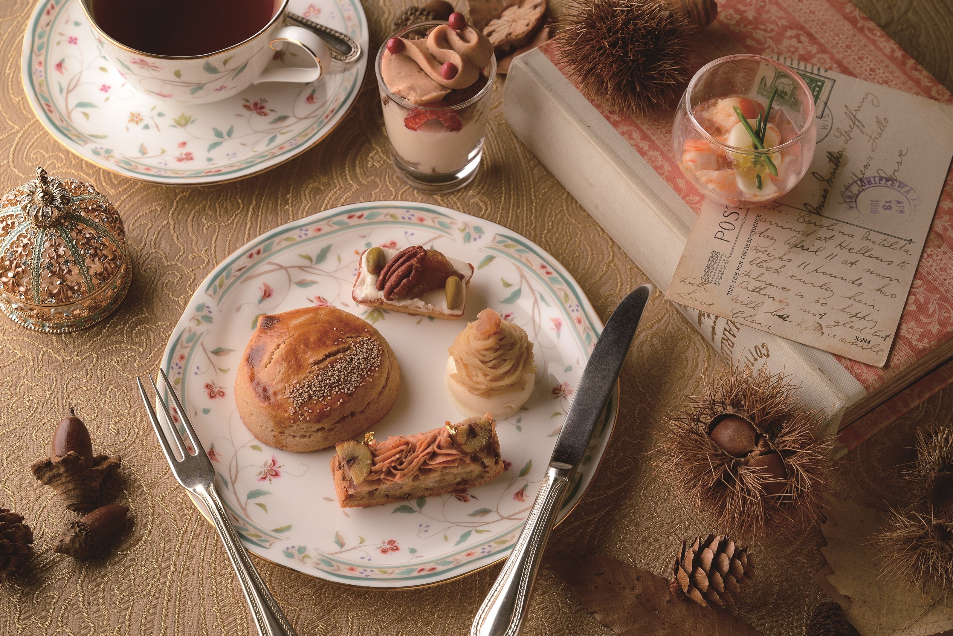下段のセイボリーでは、同じく秋の味覚の茸や洋梨などを使用した、海老のマリネとフルーツティージュレ、栗のパンケーキと鴨のロースト、栗のケーク・サレ、スモークサーモンのロールの4種をお楽しみいただけます。