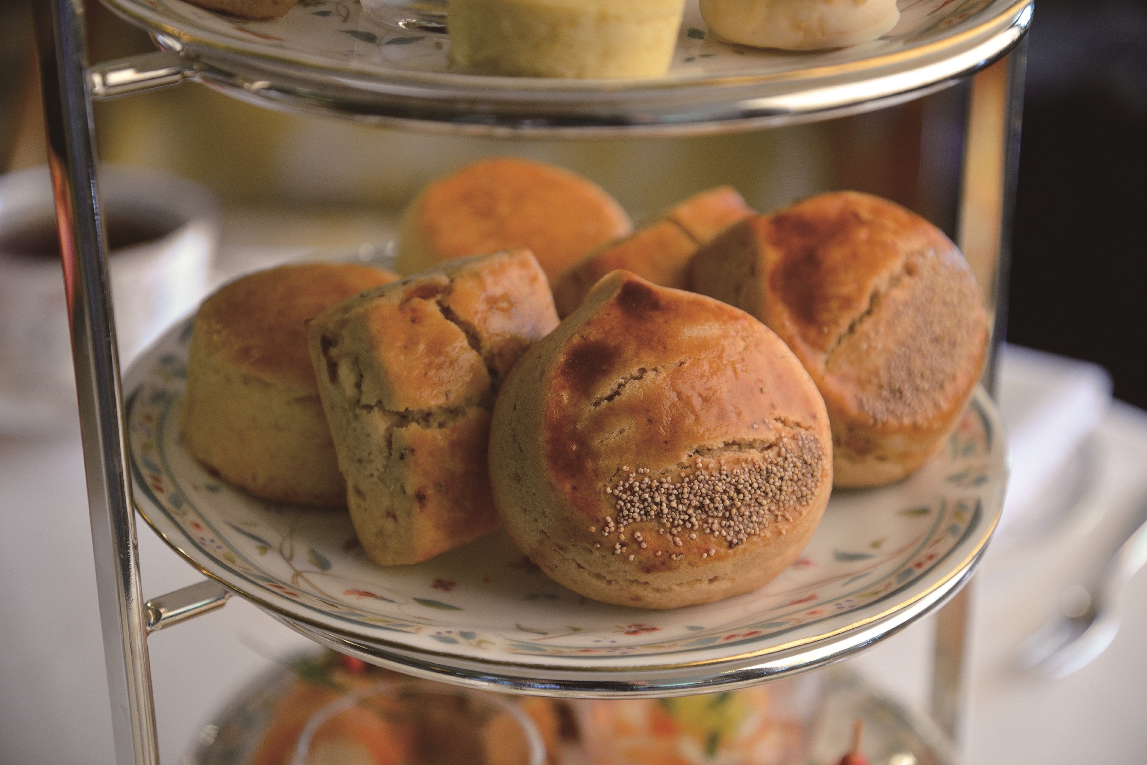 中段のスコーンは、定番のプレーンスコーンのほか、マロンペーストを練り込み、マロンリキュールを入れ栗の形にした栗スコーン、オリジナルの配合で漬け込んだ自家製ラムレーズンのスコーンと、大人の味わいが楽しめる3種をご用意。通常のクロテッドクリームとジャムの他に、栗やラム酒と相性の良いチョコチップクロテッドクリームをお好みで付けてお召し上がりください。