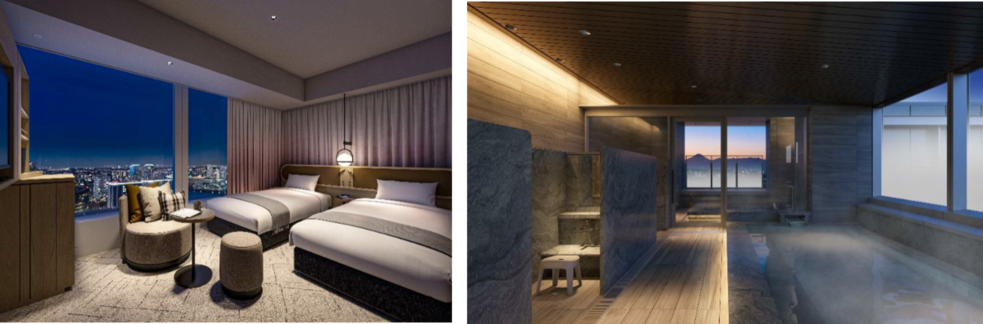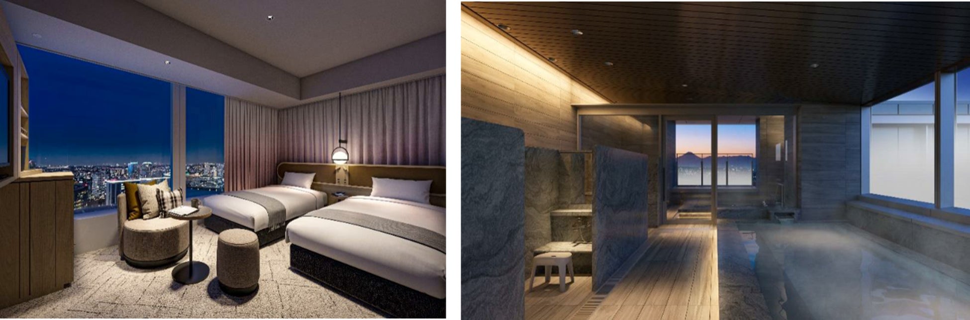 本ホテルロビーは、26階(地上約130m)に位置し、空に浮かぶ寛ぎの空間を演出します。全150室の客室は27 階以上の高層階にあり、すべての客室からみなとみらいの開放的な景色を望むことができます。客室は、「ダブル」「ツイン」「ユニバーサル」に加え、最大4名まで利用可能な2段ベッドのある「フォース」を導入し、ゲストのさまざまな利用用途に対応できる構成となっています。また、「京急 EXホテル」ブランドでは初の大浴場・露天風呂を設け、天気の良い日は富士山を見ながら入浴することができます。ビジネスだけでなくレジャー利用にも対応できる「京急EXホテル」として、多様化する宿泊ニーズに応えていきます。
