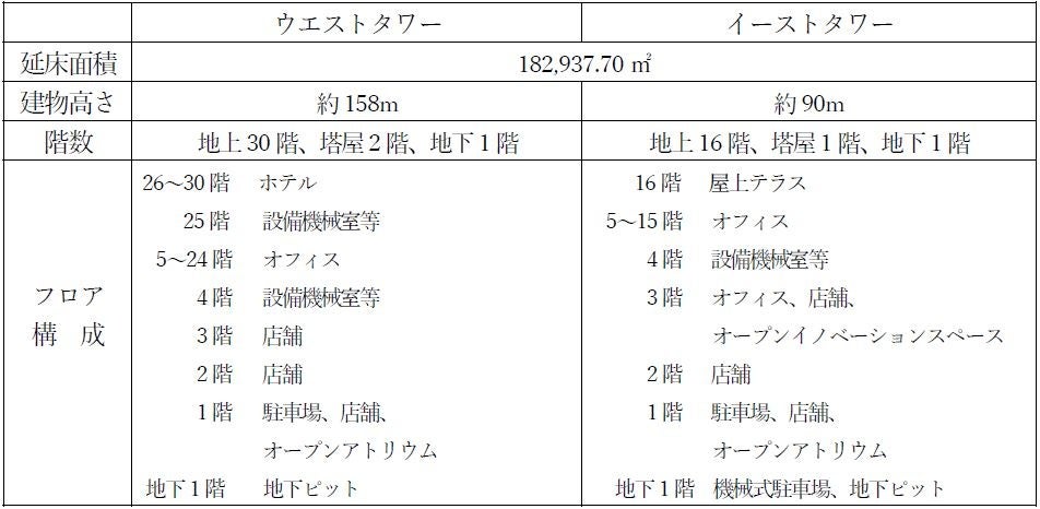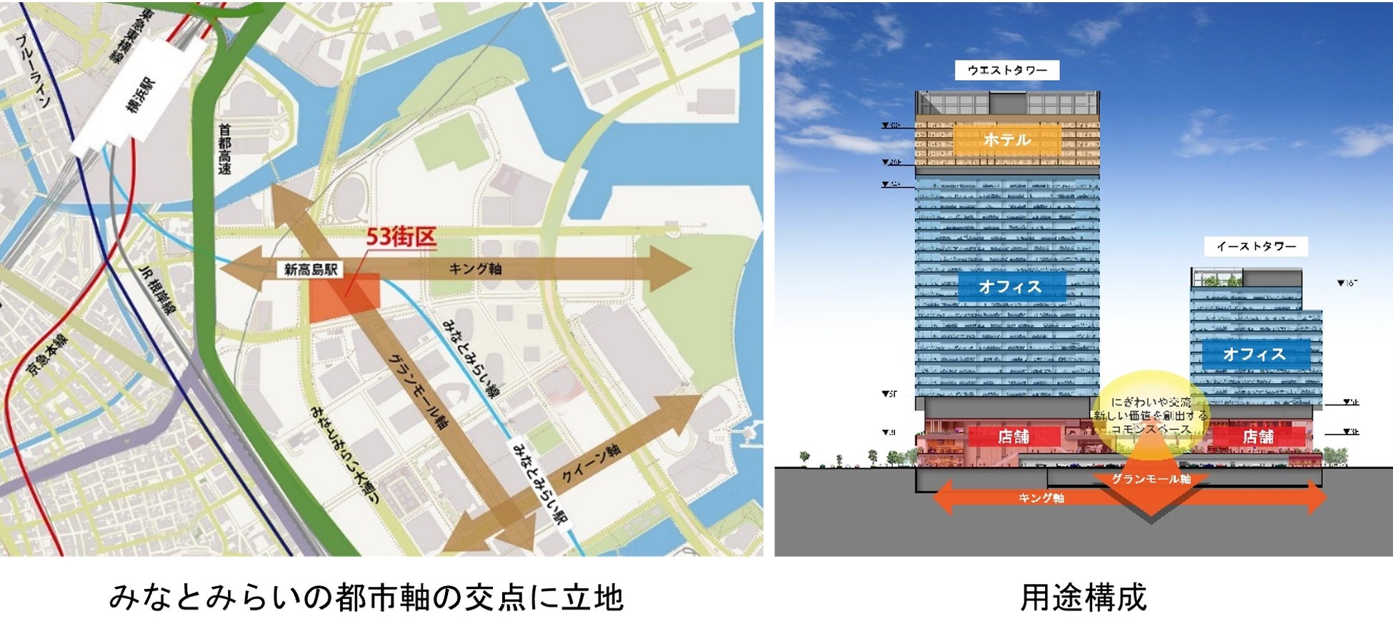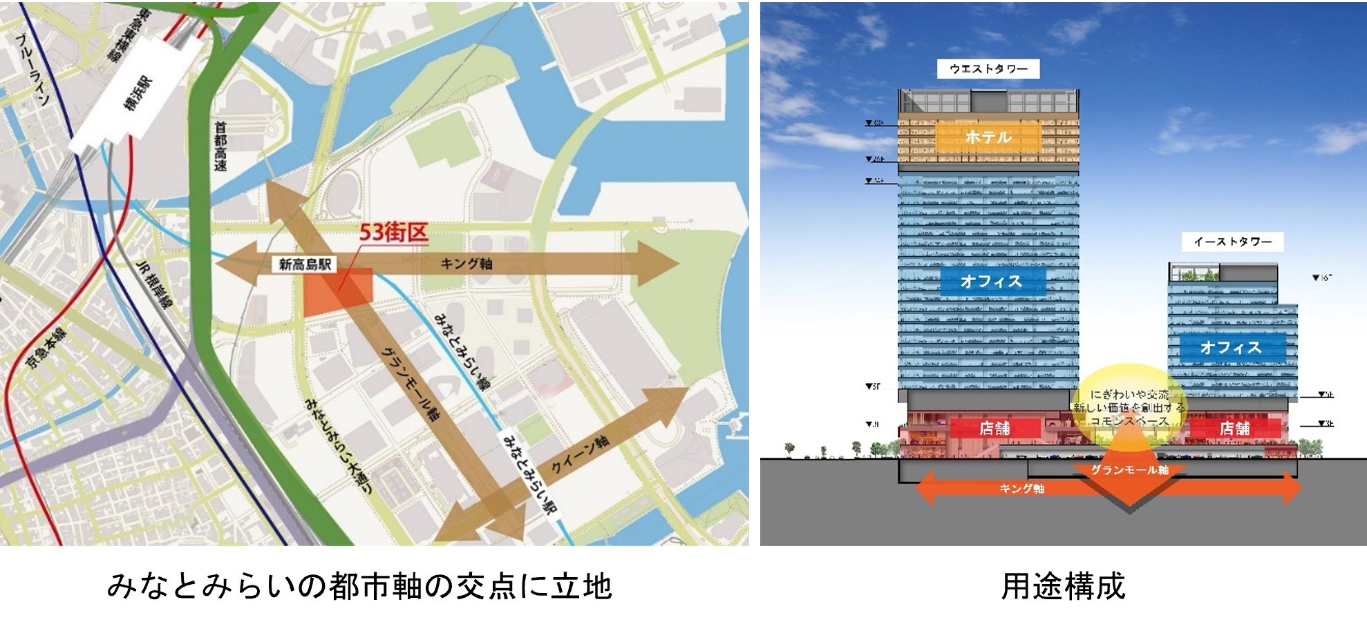 ウエストタワーは、基準階専有面積 約3,360㎡を有するオフィスを主な用途とし、高層部は「京急EXホテル みなとみらい横浜」、低層部はヤマハの体験型「ブランドショップ」や店舗で構成される多機能交流拠点です。イーストタワーは、基準階専有面積 約2,820㎡を有し、さまざまな企業が本社や研究開発拠点として利用することを想定したオフィスを主な用途とし、低層部にはオープンイノベーションスペースや店舗を備えています。街区内には、開放的なコモンスペース(広場状空地)があり、来街者やオフィスワーカーにとっての憩いの環境や交流の場を提供します。