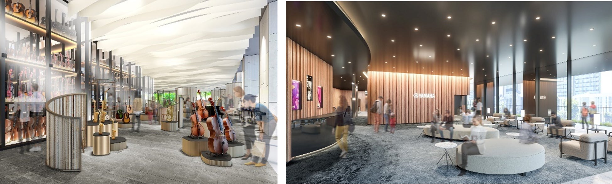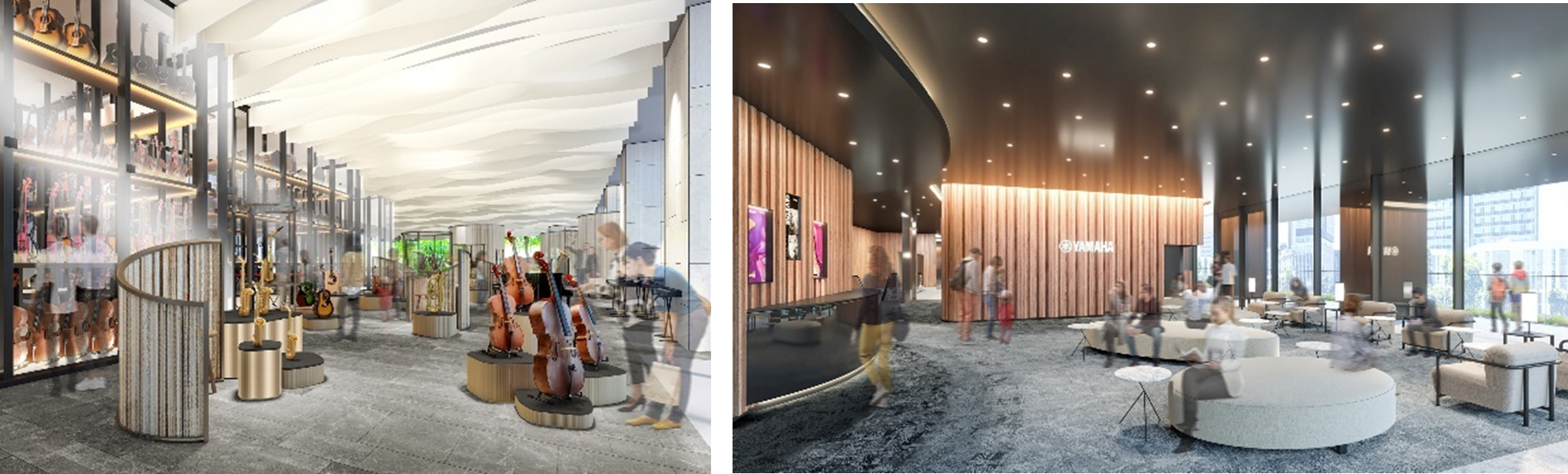 ウエストタワー1階から3階には、ヤマハの体験型「ブランドショップ」を6月初旬にオープンします。この店舗は、楽器経験の有無にかかわらず、音楽や楽器に関する新たな楽しみを発見していただくことを目的とした体験の場です。3フロアの総床面積は約2,600m²で、幅広い層の方々に気軽にご来店いただけるように、吹き抜けによる開放的なデザインを採用するほか、合計6カ所の入り口を設置するなど移動しやすいシームレスな設計になっています。