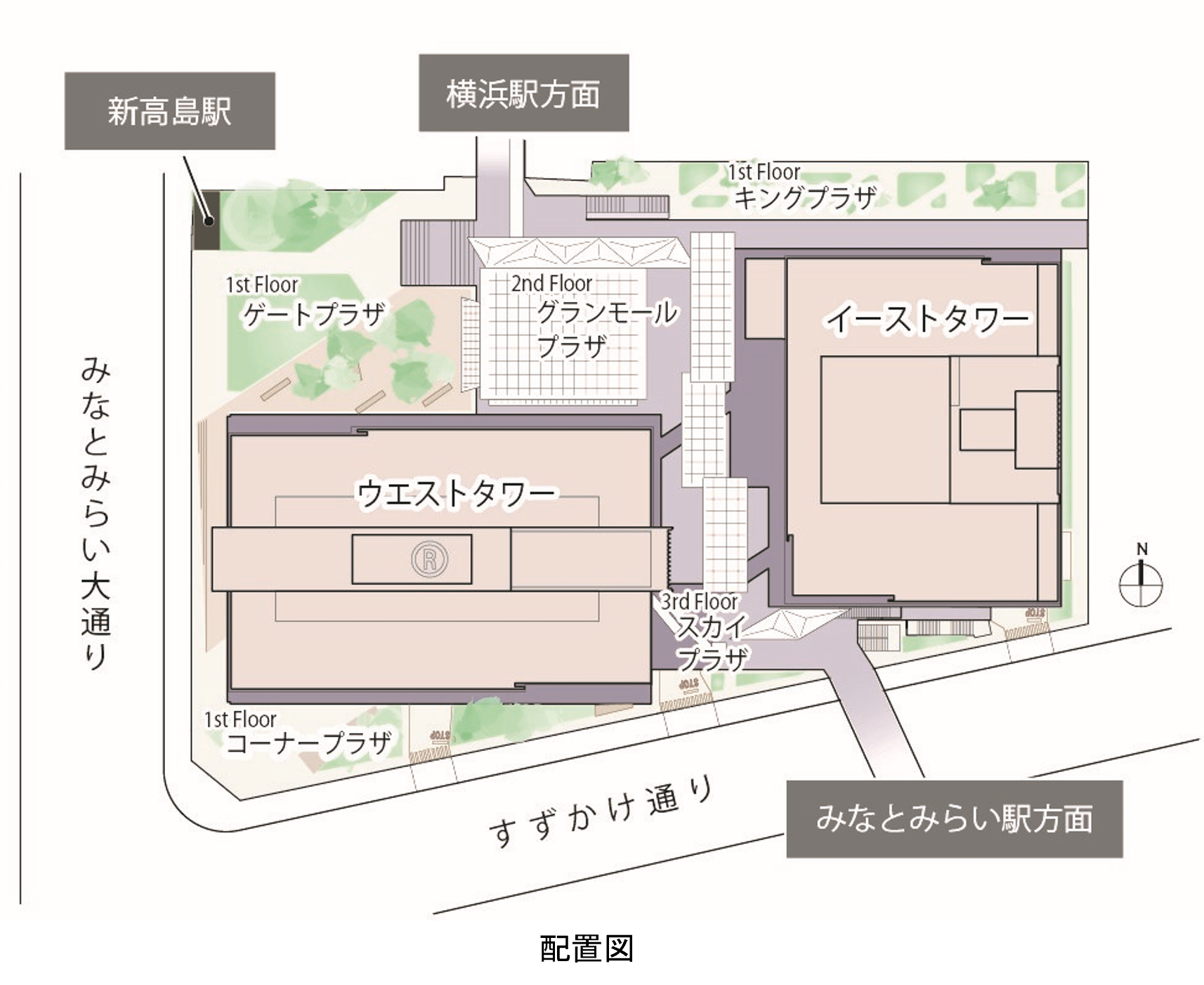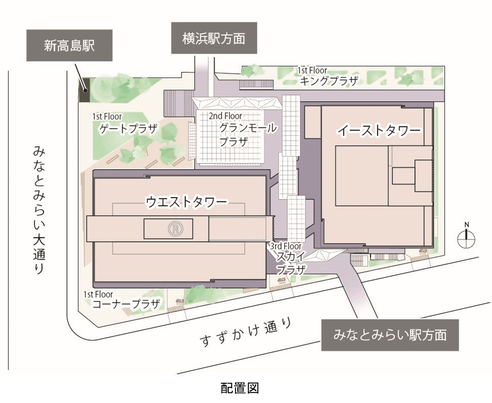 新高島駅徒歩1分、横浜駅から徒歩8分、みなとみらい21中央地区における都市軸の結節点に立地し、横浜駅方面からのペデストリアンデッキを街区内に開通し、みなとみらい駅方面への歩行者ネットワークを形成したことで、エリアの回遊性向上、エリア活性化に貢献しています。