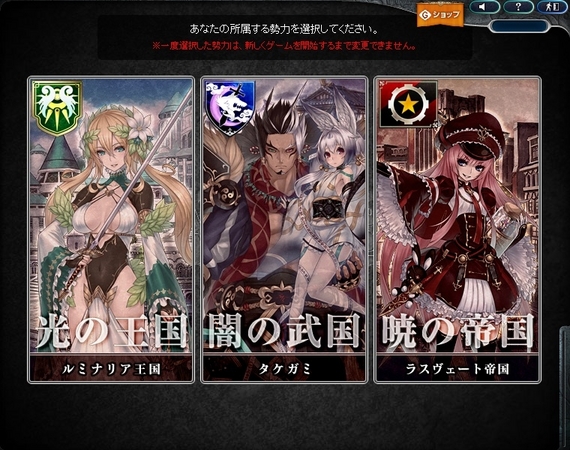 「光の王国」「闇の武国」「暁の帝国」の三国により統治されている世界で、いずれかの国の「国主」に「領主」として仕えるところから物語が始まりとなります。「国主の選択」では、あなたの好みで選択するのはもちろん、イラストから見えるであろう国民の属性から選択するのも、「戦略」の一つとなってくるでしょう。