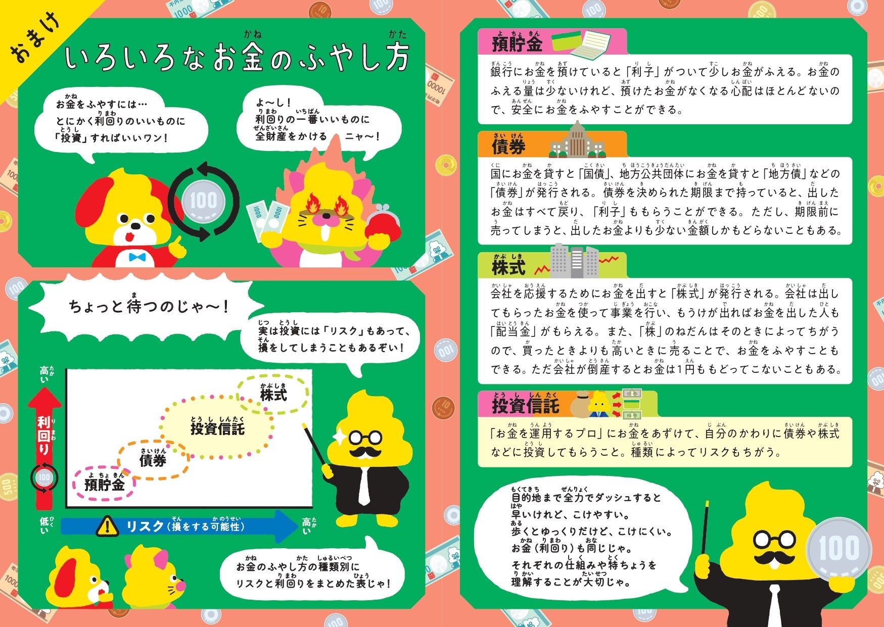 冊子の巻末では、いろいろなお金の増やし方を紹介。預貯金だけでなく、リスクに応じた増やし方があることをうんこ先生らがわかりやすく伝えています。