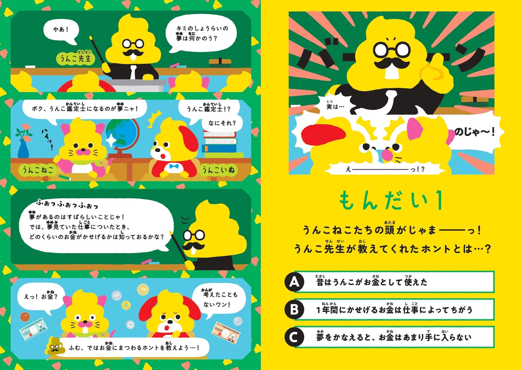 冊子はうんこドリルでおなじみのキャラクター・うんこ先生がうんこいぬとうんこねこに将来の夢を問う場面から始まります。