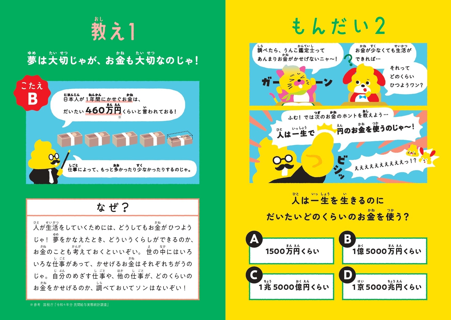 冊子の内容はクイズ形式で全5問。うんこ先生がうんこねこ達の疑問に次々と答えて、冊子の巻末では、いろいろなお金の増やし方を紹介。債券や株式などを、リスクも含めわかりやすく伝えています。クイズの中にちりばめられたシュールで可愛らしいうんこのイラストとテンポよく展開されるストーリーが、子どもの興味関心を強く惹きつけます。