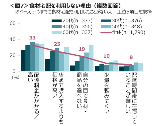 今までに食材宅配を利用経験のない人では、「配達料金がかかる/高い」「店頭で購入するよりも価格が高い」「自分の目で食材・商品を選べない」という点があがった。特に60代は、「店頭より価格が高い」「自分の目で選べない」が突出して高い。<図7>