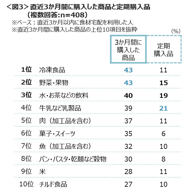 3か月以内に購入した商品は、「冷凍食品」「野菜・果物」「水・お茶などの飲料」が4割台。そのうち”定期購入”している商品は「牛乳など乳製品」「水・お茶などの飲料」「野菜・果物」である。<図3>