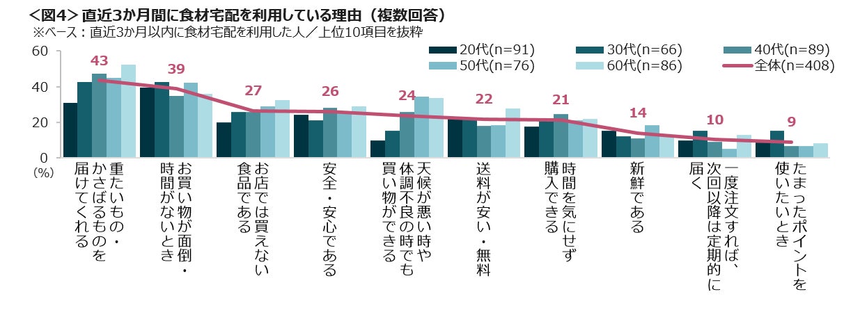 食材宅配を利用するのは、「重たいもの・かさばるものを届けてくれる」43%と「お買い物が面倒・時間がないとき」39%の理由が高い。加えて60代は「お店では買えない食品」「天候が悪い・体調不良時でも買い物ができる」も3割を超えた。<図4>