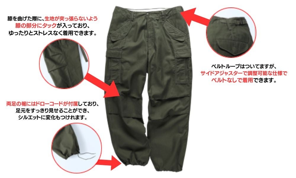 ミリタリーウェアの象徴的アイテムであるM65型。アメリカ軍において1950年代より採用されたM-51カーゴの後継型として、1965年に採用されたM-65カーゴパンツは、まさにカーゴパンツの完成形ともいえる存在。最大の特徴である大型のポケットを搭載し、昨今のトレンドというだけでは無く、実用性にも富んだ末永く穿けるアメカジの大定番ボトムです。