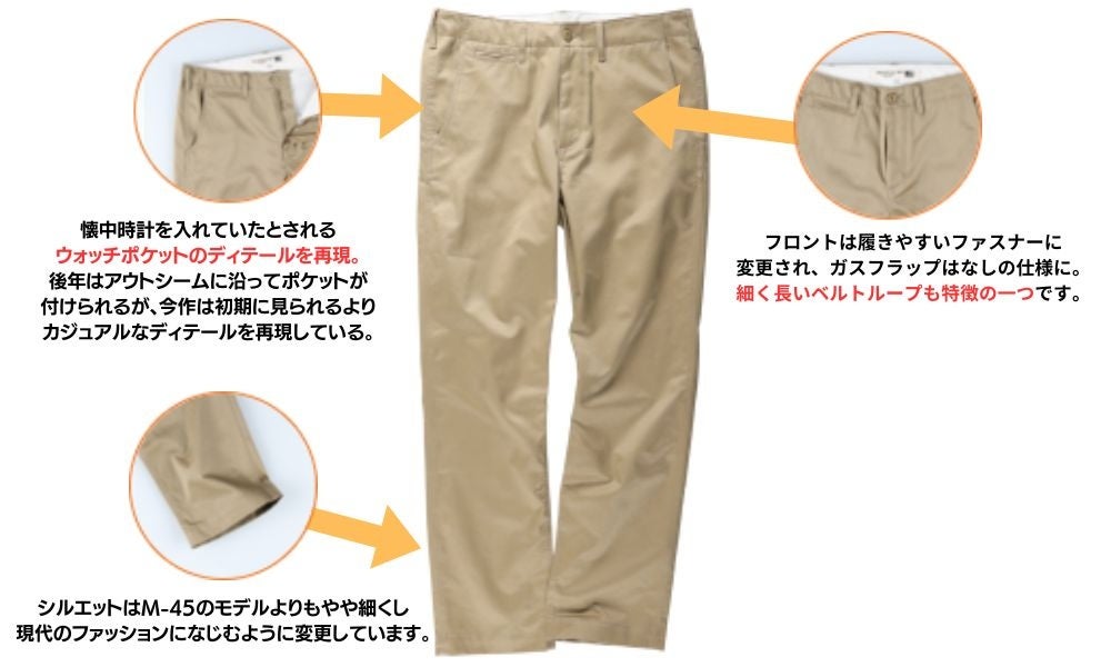 通常のチノクロスに比べ、丈夫で光沢に優れたウエポン素材を再現。40年代モデルをデザインベースとしつつ、シルエットは60年代以降のすっきりとした形を採用。万人が穿けるスマートシルエットはジャケットスタイルにもマッチ。まさに「良いトコ取り」のハイブリッドモデルが完成。