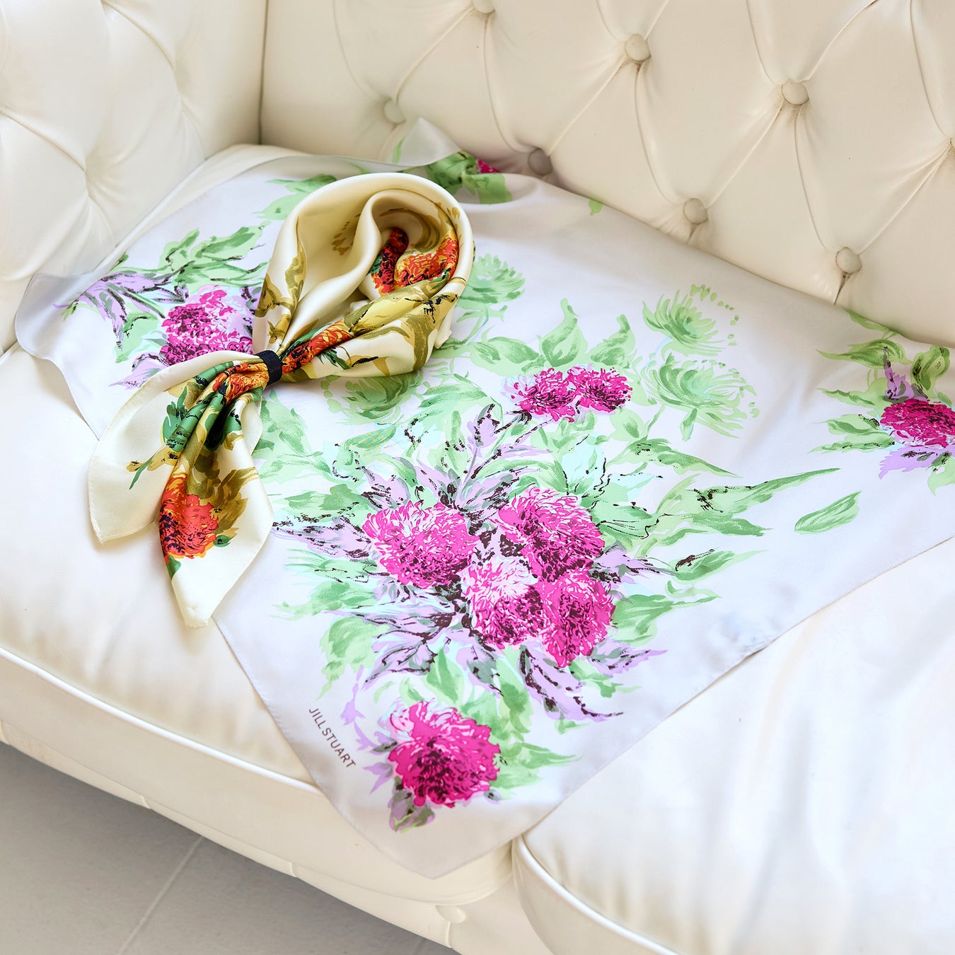 ・シルクスクエアスカーフ 各¥10,450 (税込) サイズ:約82×82cm ◎ご家庭でお洗濯できます。