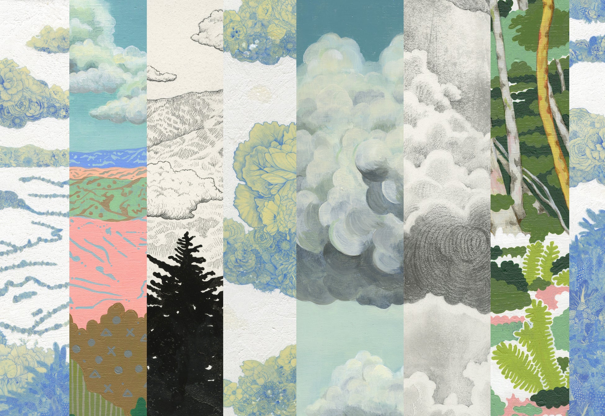 今回の展示では、美しい空と雲、森、木立などをメインのモチーフとした作品9点を展示します。「時系列がバラバラになってはいるけど、つづいている物語」を表現した新作7点をはじめ、今回の展示で初めての一般公開を果たす、氏のデビュー作「ファンタスティック・サイレント」のポスターとして収録された作品も展示いたします。
