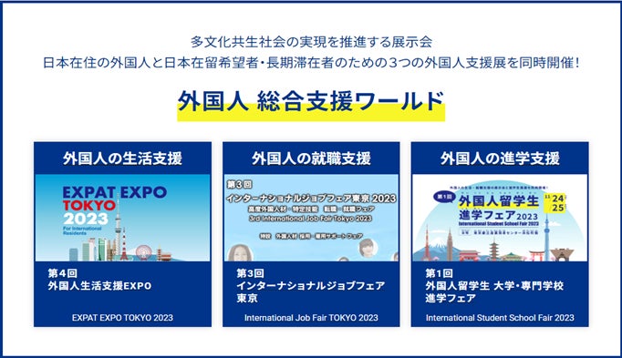 〈外国人 総合支援ワールド2023〉 生活・レジャー支援、就職支援、進学支援 の3つのテーマにて3展示会を同時開催!