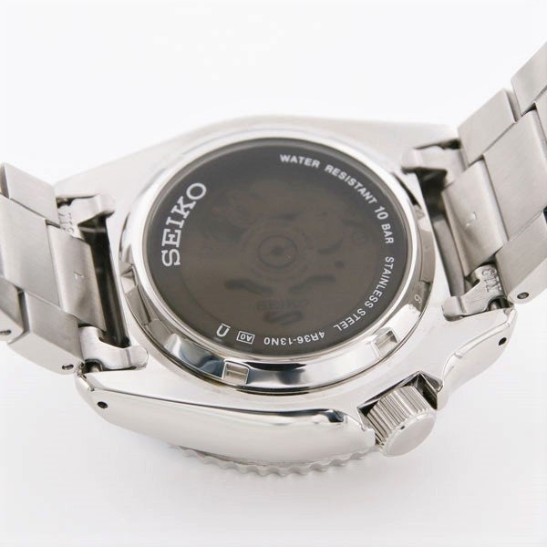潜水艦の"ソナー(水中の音波を探知する装置)"をイメージし、ダイヤルに透明のプラスチックを採用したセイコーの名品「タイムソナー」。本作はスケルトン仕様でカレンダーディスクの動きなどを楽しむことができる斬新なデザインが特徴です。