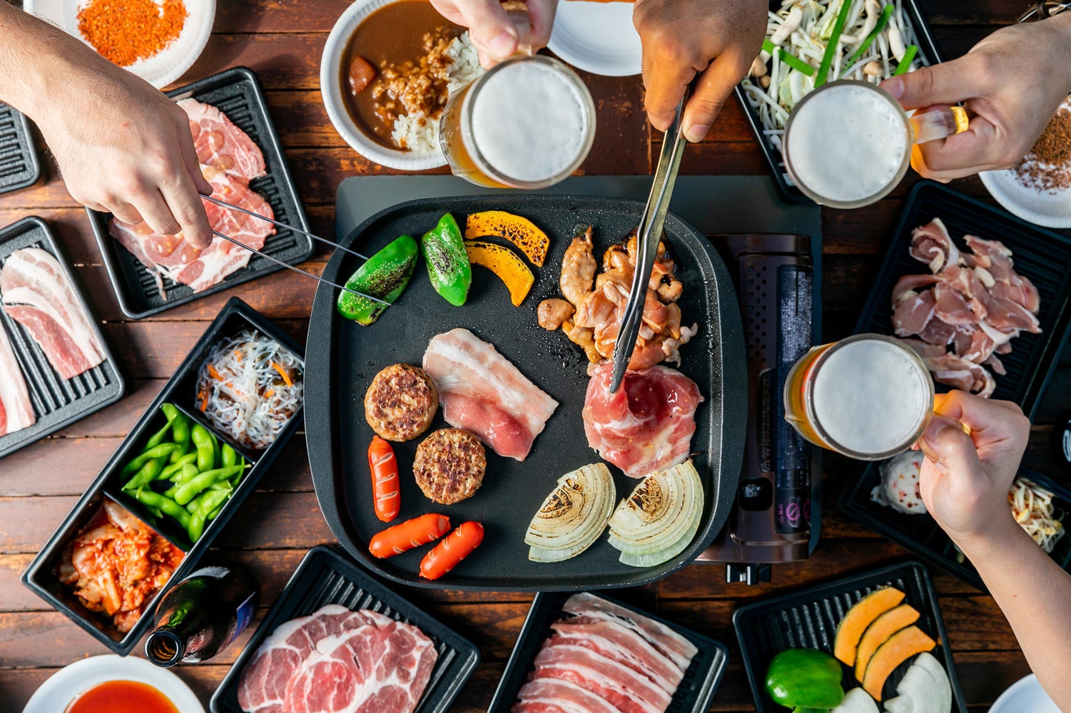 お客様の様々なニーズにお応えするため、充実した食べ放題・飲み放題メニューをご用意しております。お肉だけでなく、多彩な種類のサイドメニューも食べ放題でお楽しみいただけます。ファミリーやカップル、お子様連れの方々、お仕事帰りやショッピングの後に最適です。屋上に位置しながらも、一部屋根が設けられたエリアもございますので、天候を気にせずバーベキューをお楽しみいただけます。