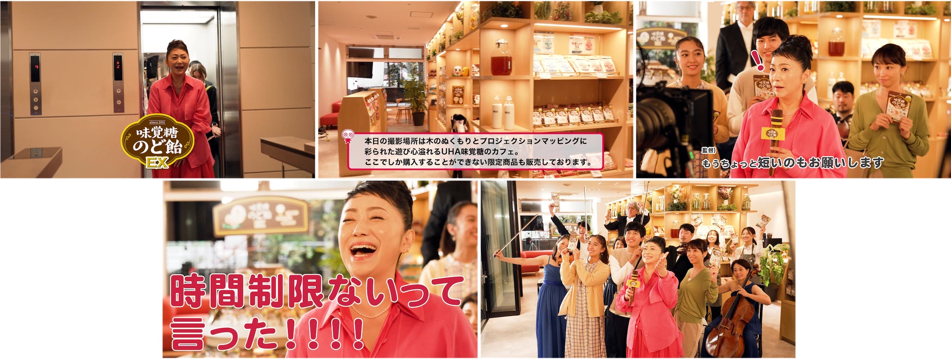 舞台は、UHA味覚糖の中にある「UHA PARK & CAFE」。そこに登場するのは、リポーターに扮した石川さゆりさん。お客さんに味覚糖のど飴󠄀をおすすめしながら、突撃インタビューに挑戦。「ハーブの匂いがすごい」「ピリッとする」「意外にもハニーミルクの味」などいろんなコメントを引き出す石川さんでしたが…「歌いましょう」の合図で、なぜか指揮者と弦楽四重奏が登場!最後は、お客さんを巻き込みながら、味覚糖のど飴󠄀の歌を歌うストーリーとなっています。