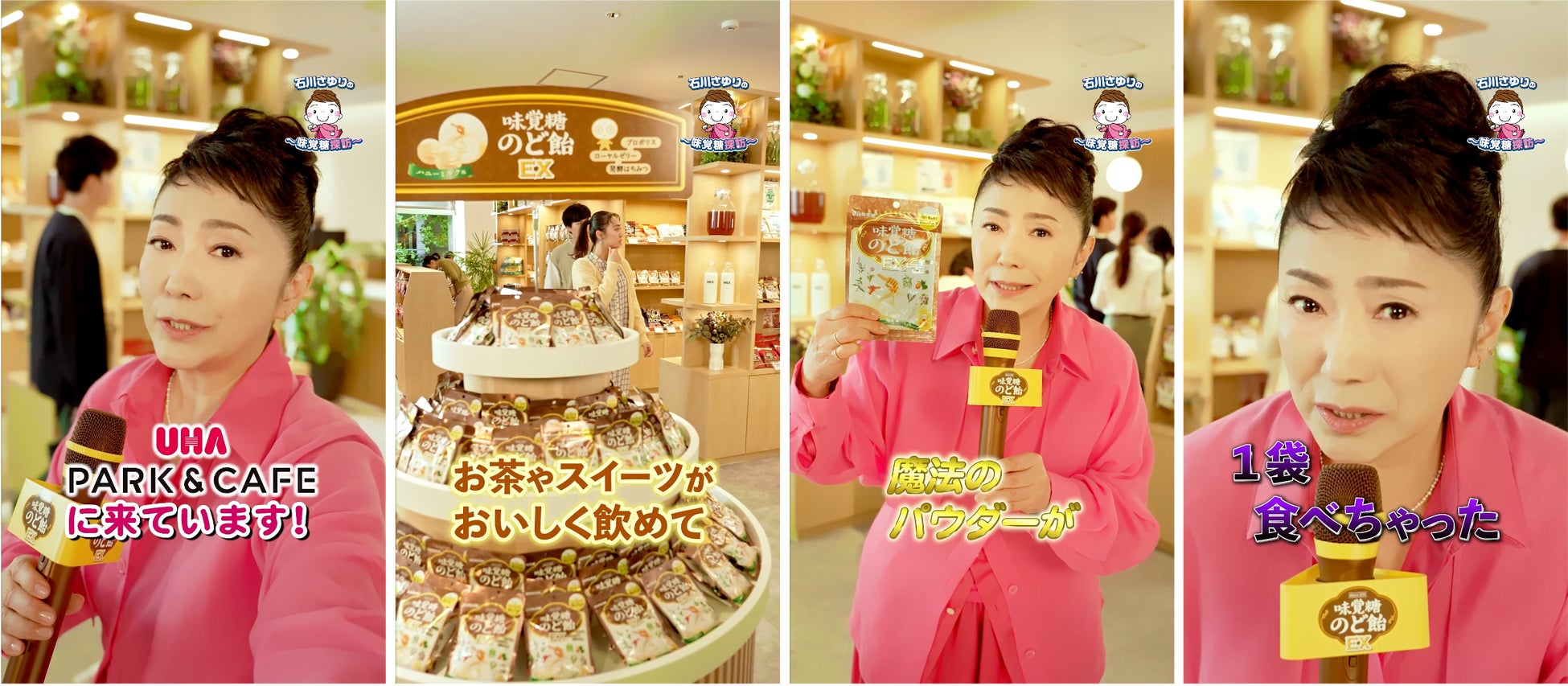 CMと同じく、石川さゆりさんが「UHA PARK & CAFE」を訪れるストーリー。自撮りで店内を案内したり、商品の感想を伝えたり…そして味覚糖のど飴󠄀にまつわるスタッフの実話を公開するなど、CMとは違う展開となっています。合わせてご注目ください!