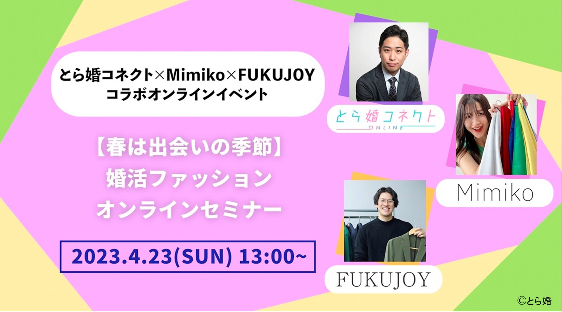 アニメや漫画・ゲームなど趣味をこよなく愛するオタク層向けに特化した結婚相談オンラインサービスとら婚コネクトは、恋活・婚活向けファッションコーディネートサービスを提供するFUKUJOY、イメージコンサルタントのMimikoさんと合同で、無料の婚活ファッションオンラインセミナーを2023年4月23日(日)に開催いたします。