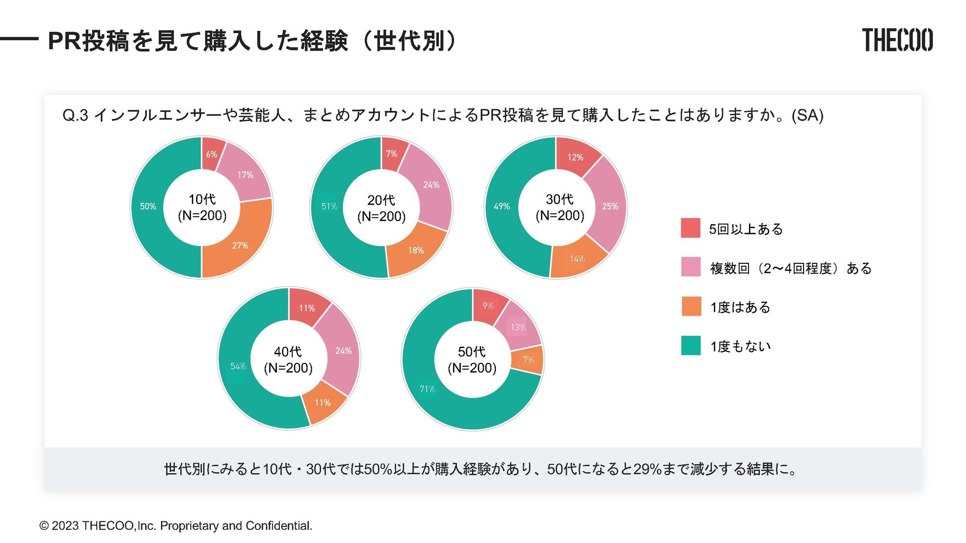 「インフルエンサーや芸能人、まとめアカウントによるPR投稿を見て購入したことはありますか?」という質問に対し、1度以上あると回答した人は、10代は50%、20代は49%、30代は51%と、10代〜30代では約半数の人がPR投稿をみて1度以上は購入経験があることからSNSが購買意欲の向上に大きく影響していることが伺えます。