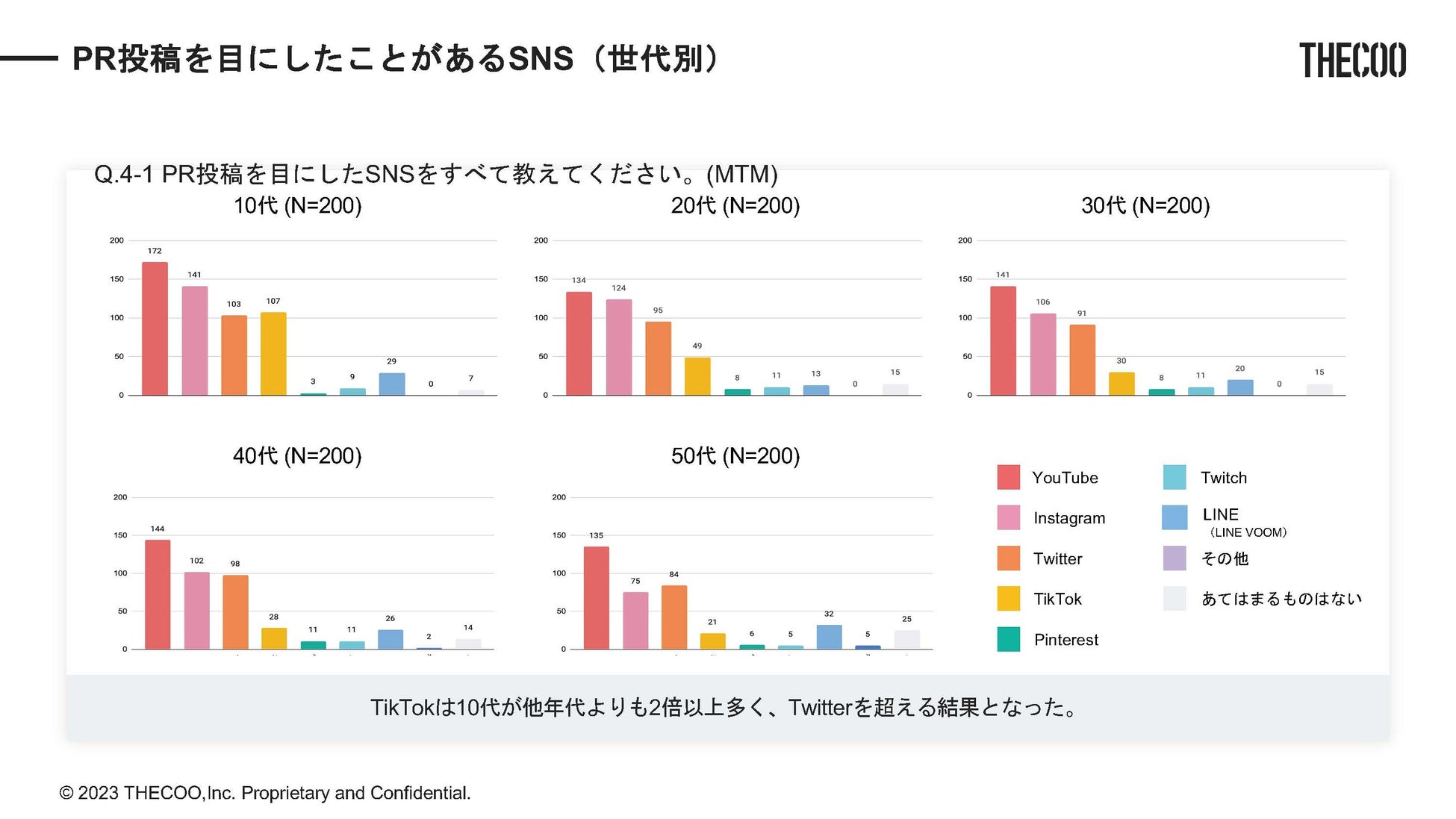 「PR投稿を目にしたSNSをすべて教えてください」という質問に対し、どの年代でもYouTubeがもっとも多い結果に。10代は他年代と比較してTikTokの割合が2倍以上あり、10代のTikTok利用率が高いことが伺えます。