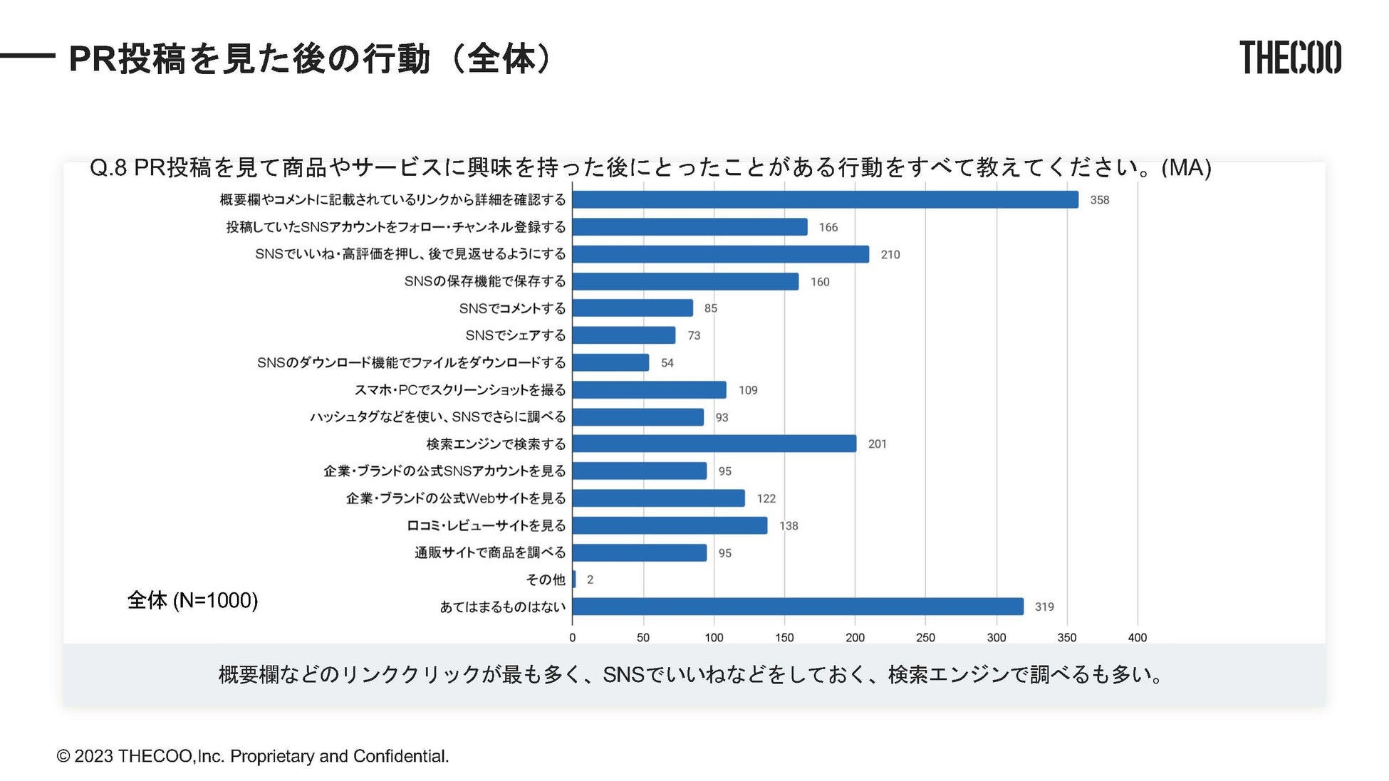 ・PR投稿をみて商品やサービスに興味をもった後にとったことがある行動は「概要欄やコメントに記載されているリンクから詳細を確認」「SNSのでいいねや高評価を押して、後で見返せるようにする」「検索エンジンで検索する」が多い。