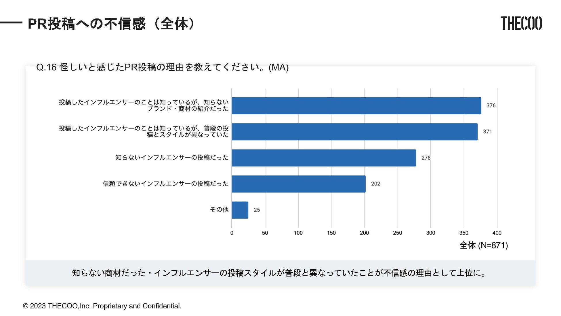 その理由に「知らないブランド・商材の紹介だった」「普段の投稿スタイルと異なっていた」等が多く、インフルエンサーとブランド・商材の相性がよいこと、インフルエンサーの投稿スタイルにそった投稿内容であることの重要性が伺えます。