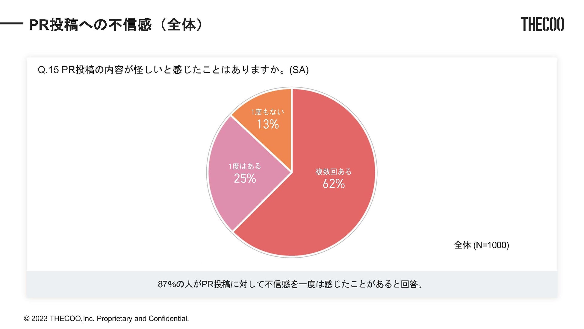 ・64%がPR投稿は通常投稿と比較して信頼性は変わらないと回答。しかし87%が一度はPR投稿の内容に不信感を抱いた経験がある。
