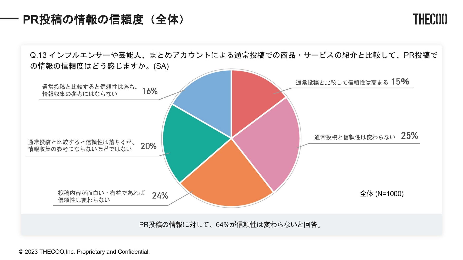「インフルエンサーや芸能人、まとめアカウントによる通常投稿での商品・サービスの紹介と比較して、PR投稿の情報度はどう感じますか」という質問に、「信頼性は高まる」「信頼性は変わらない」「投稿内容が面白い・有益であれば信頼性は変わらない」と回答したのは64%となり、半数以上はPR投稿であることが信頼度に影響を与えないといえます。