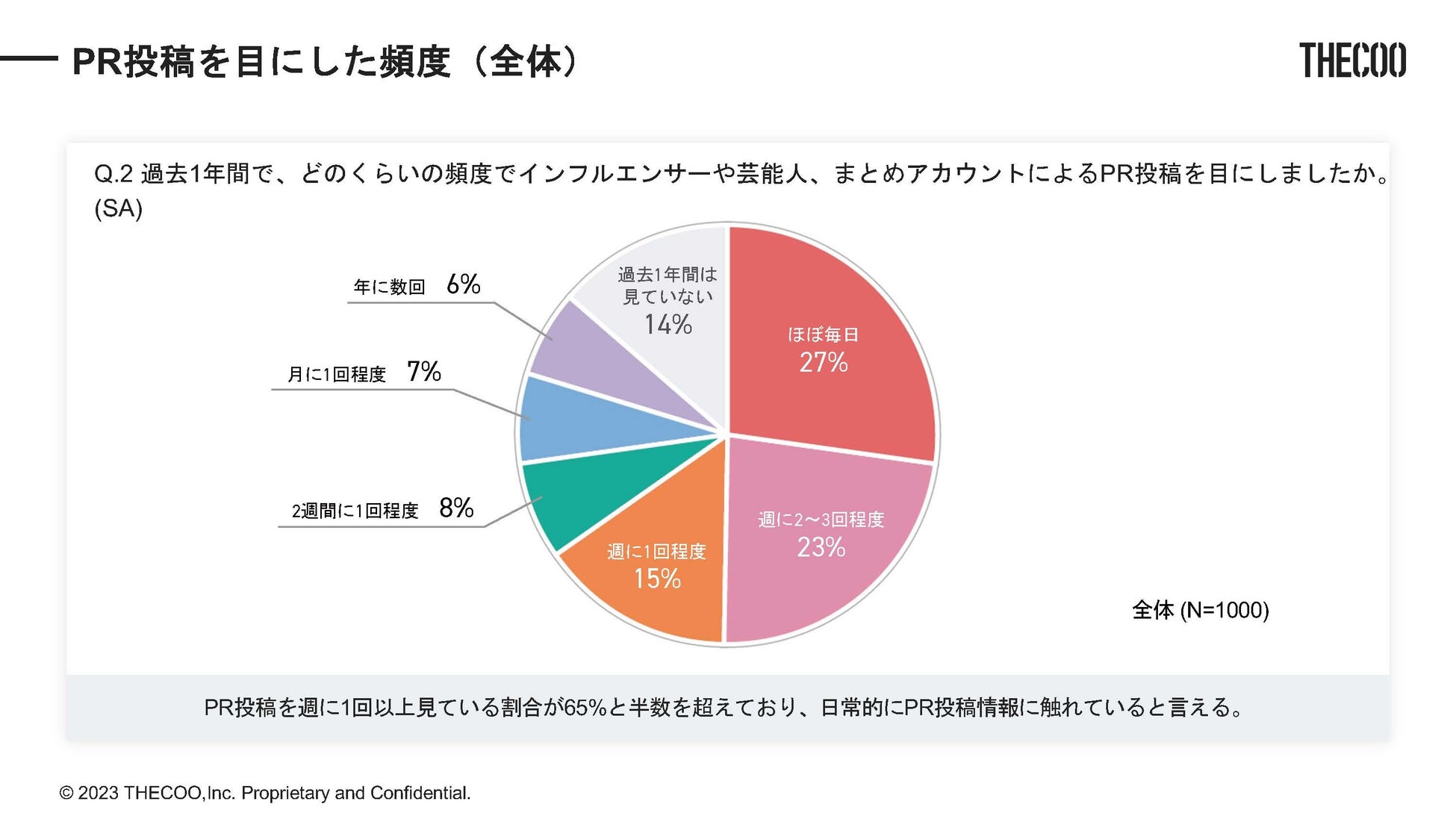 ・PR投稿を目にした頻度は「ほぼ毎日」27%、「週に2〜3回程度」23%、「週に1回程度」15%と、週に1回以上PR投稿を見たことがある人が65%に。