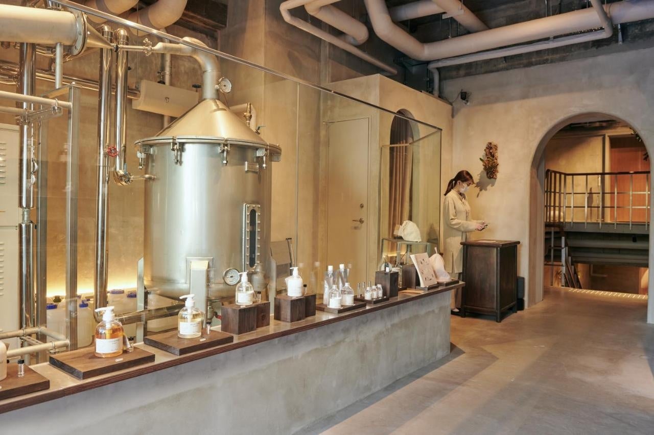 九谷焼など工芸品を扱うギャラリー「眞美堂」のビルを改装した建物は、アーチ型の窓が特徴です。客室のインテリアデザインも曲線が特徴的です。1階には蒸留所が併設、サウナ付きの客室では、蒸溜機から抽出された芳香蒸溜水を使ってセルフロウリュも体験できます。