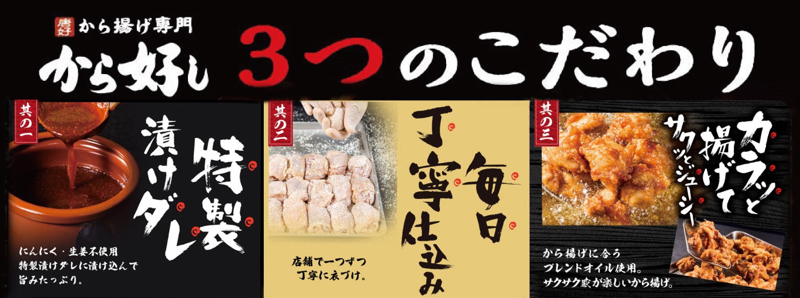 暴れん坊チキンが監修した「甘だれ」に、赤・白・黒の3種のペッパーを効かせ、ピリ辛の味わいに仕上げました。サクッとジューシーな『から好し』のから揚げに、“ピリ辛甘だれ”は相性抜群で、おかずやおつまみにもぴったりです。