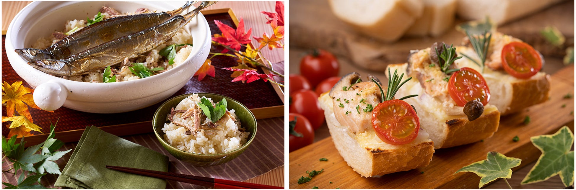 左:「焼き秋刀魚としめじの炊き込みご飯」。焼いた秋刀魚としめじの旨味がお米一粒一粒に染み込んだ豊かな味わいをお楽しみください。