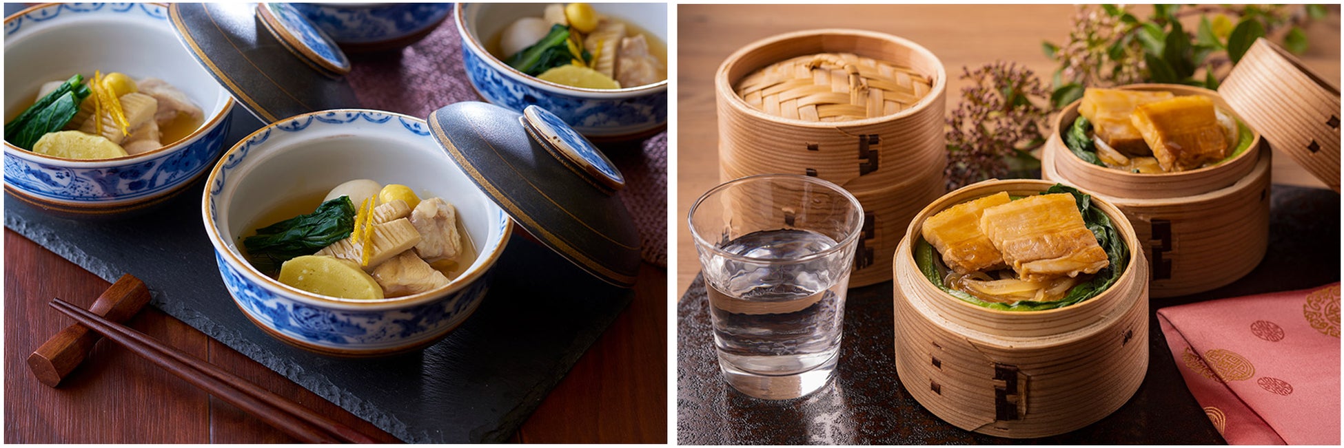 右:中国料理・東坡肉(トンポーロー)をわっぱ飯にアレンジ。豚バラ肉と玉ねぎをじっくり煮込み、麦飯に乗せ、わっぱで蒸してご提供します。わっぱの蓋を開けた瞬間の香りや湯気に食欲がそそられます。