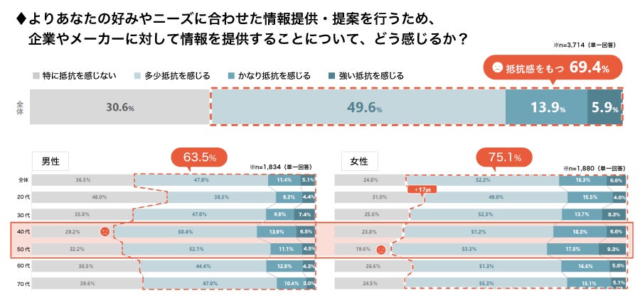 約7割が企業へのデータ提供に抵抗感。女性や中高年層において抵抗感がより顕著に