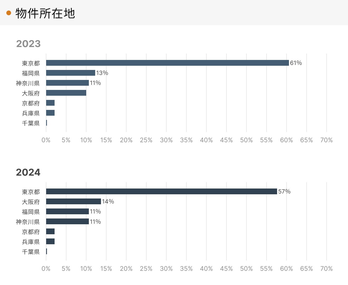 物件所在地は、東京都が最も多く57%、続いて大阪府が14%(前年比4ptアップ)、福岡県と神奈川県が同率で11%となりました。大阪府が伸びた要因として、2024年にまちびらきをした梅田エリアの盛り上がり、大規模イベントの開催や今後計画されている交通網の発達が考えられます。