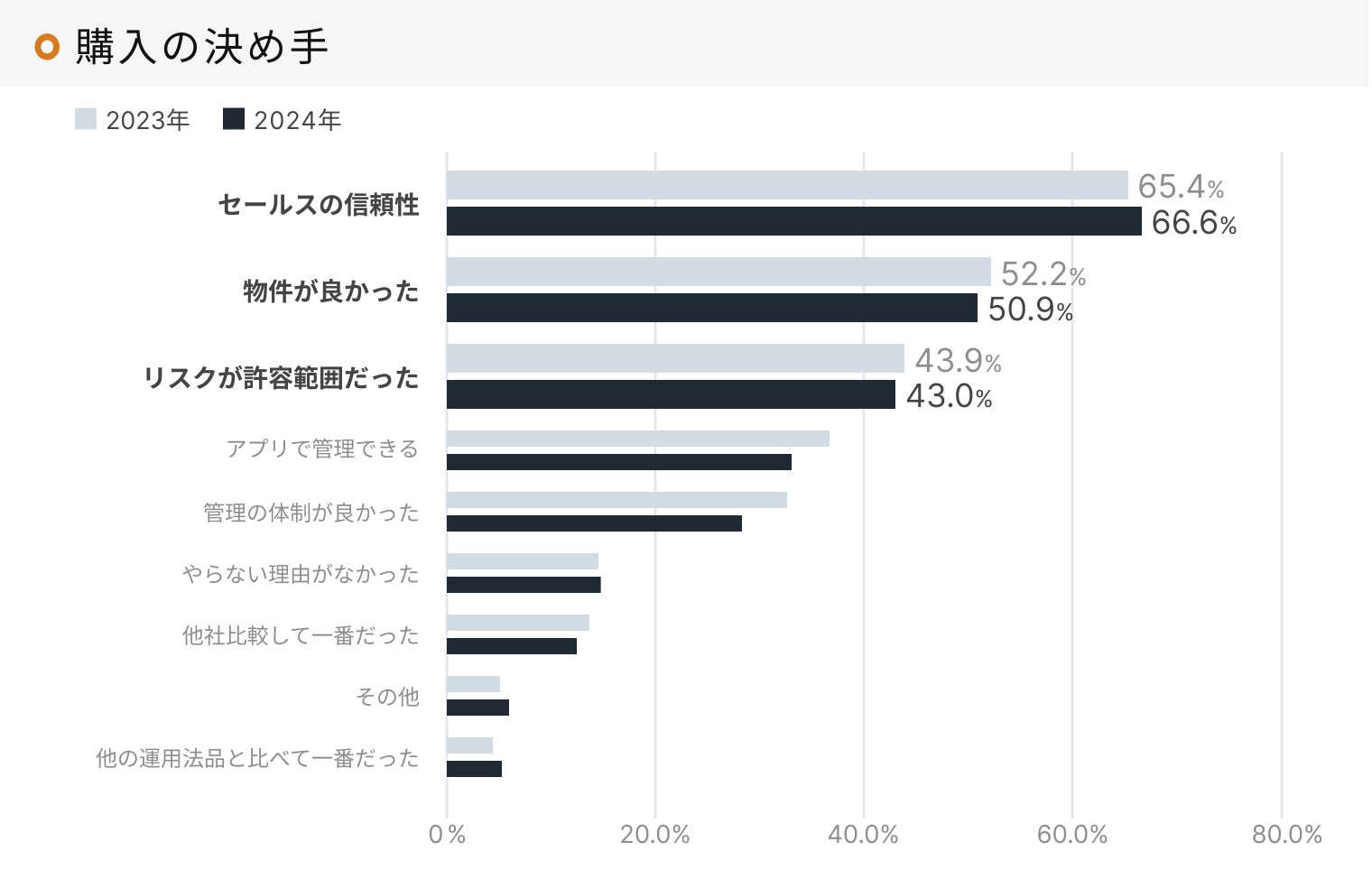 購入の決め手への回答は、「セールスの信頼性」の66.6%が最も多く、「物件が良かった」の50.9%、「リスクが許容範囲だった」の43.0%となりました。お客様から「疑問点を納得いくまで説明してくれた」、「自分の納得する物件を購入できた」といった声が寄せられました。