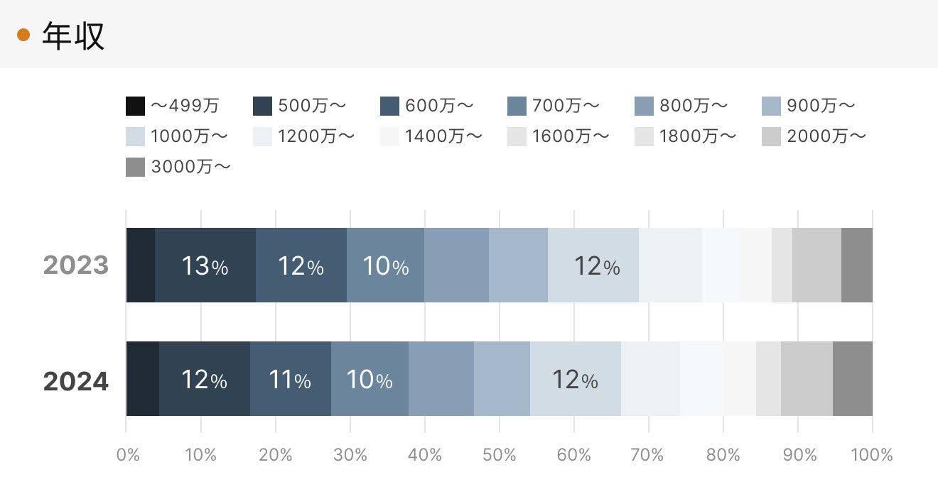 年収のボリュームゾーンは500万円台と1,000万円〜1,200万円未満台が同率12%、600万円台が11%、700万円台が10%となっています。さらに1,200万円以上の割合が増えています。
