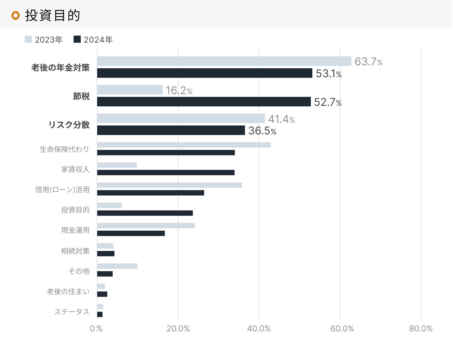 投資目的として最も多いのは「老後の年金対策」の53.1%でした。続いて「節税」の52.7%(前年比36.5ptアップ)、「リスク分散」の36.5%という結果となりました。「節税」の割合が増加している要因のひとつに、年収1,200万円以上の成約顧客が増加したことが考えられます。